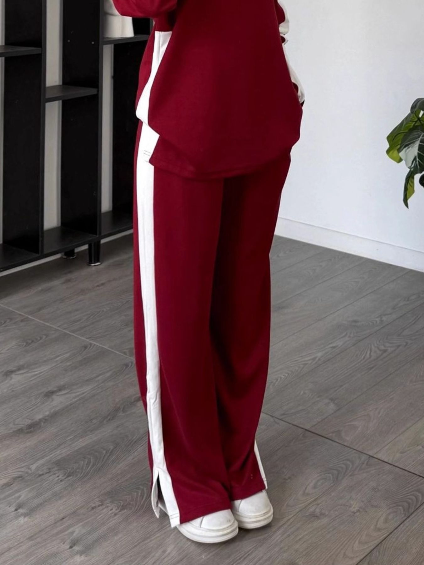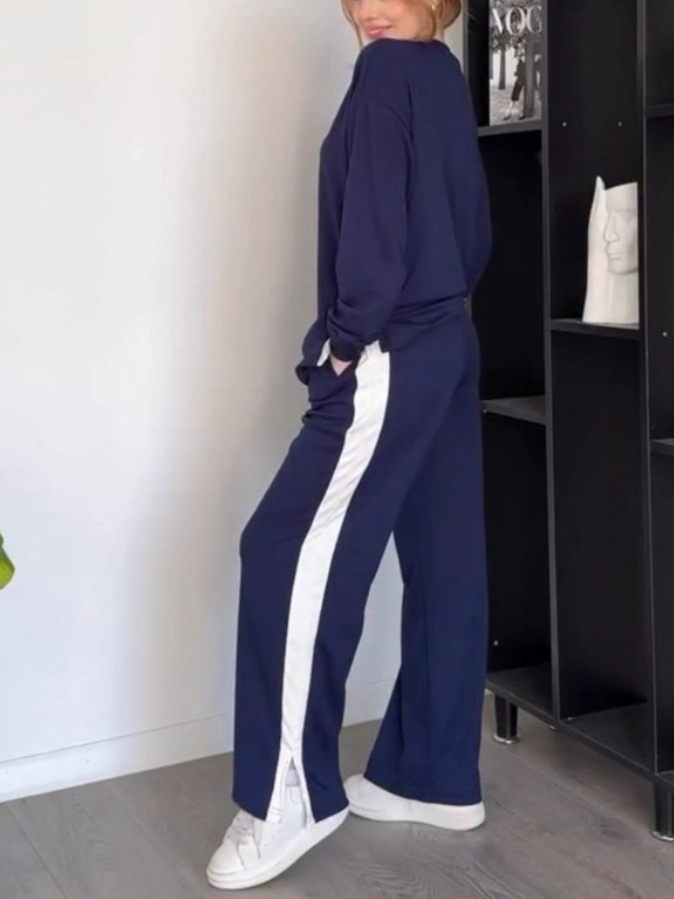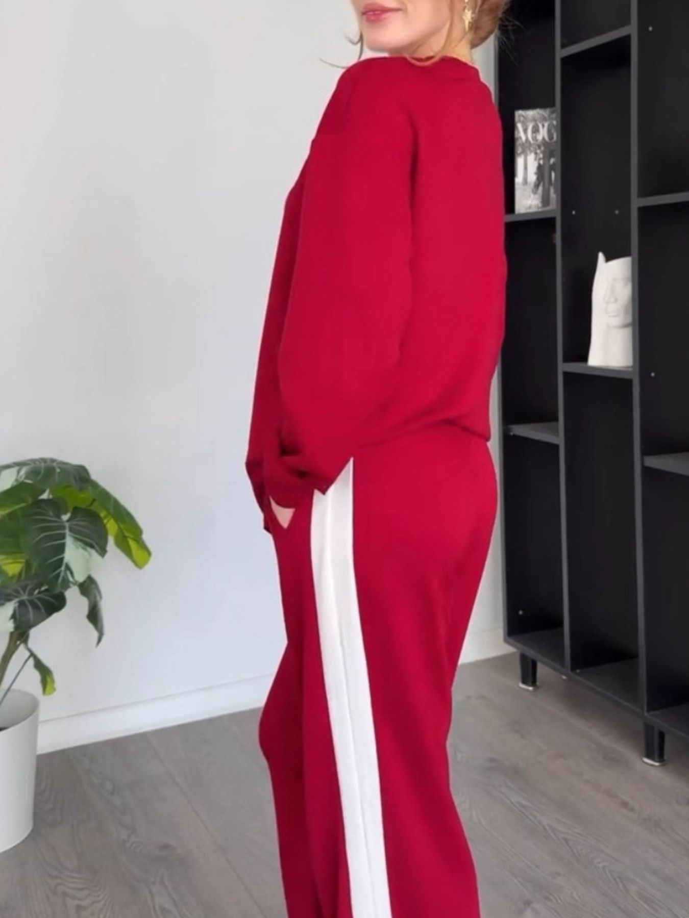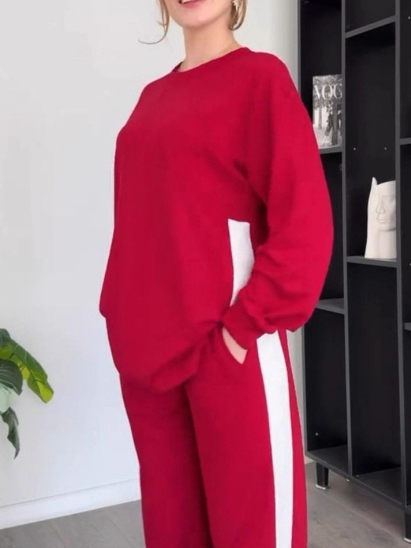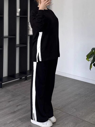 Full Size Contrast Round Neck Top and Pants Set Plus Size