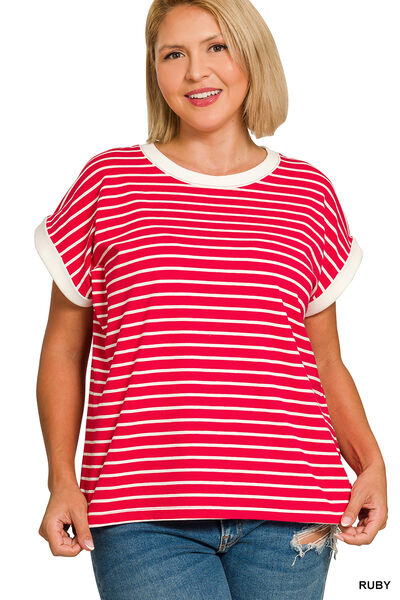 Full Size Contrast Trim Cap Sleeve Stripe Tee Plus Size
