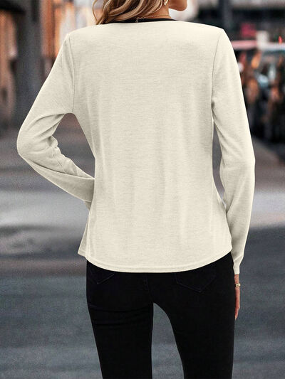 Full Size Crisscross Contrast Trim Long Sleeve T-Shirt