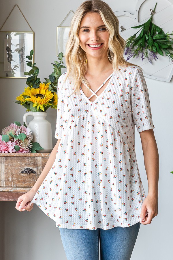 Full Size Crisscross Ditsy Floral Babydoll Top Plus Size