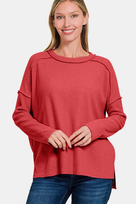 Full Size Exposed Seam Brushed Round Neck Sweater