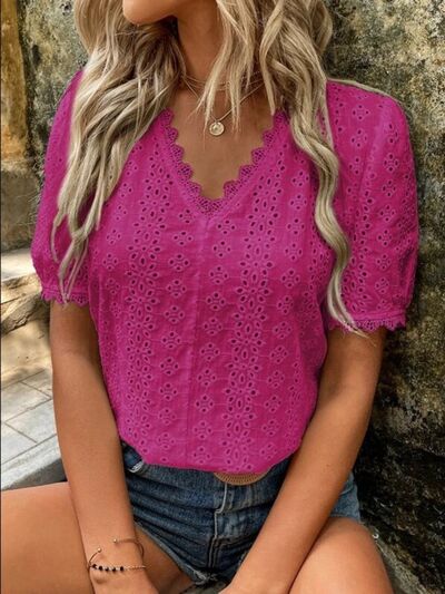 Full Size Eyelet V-Neck Short Sleeve Blouse Plus Size