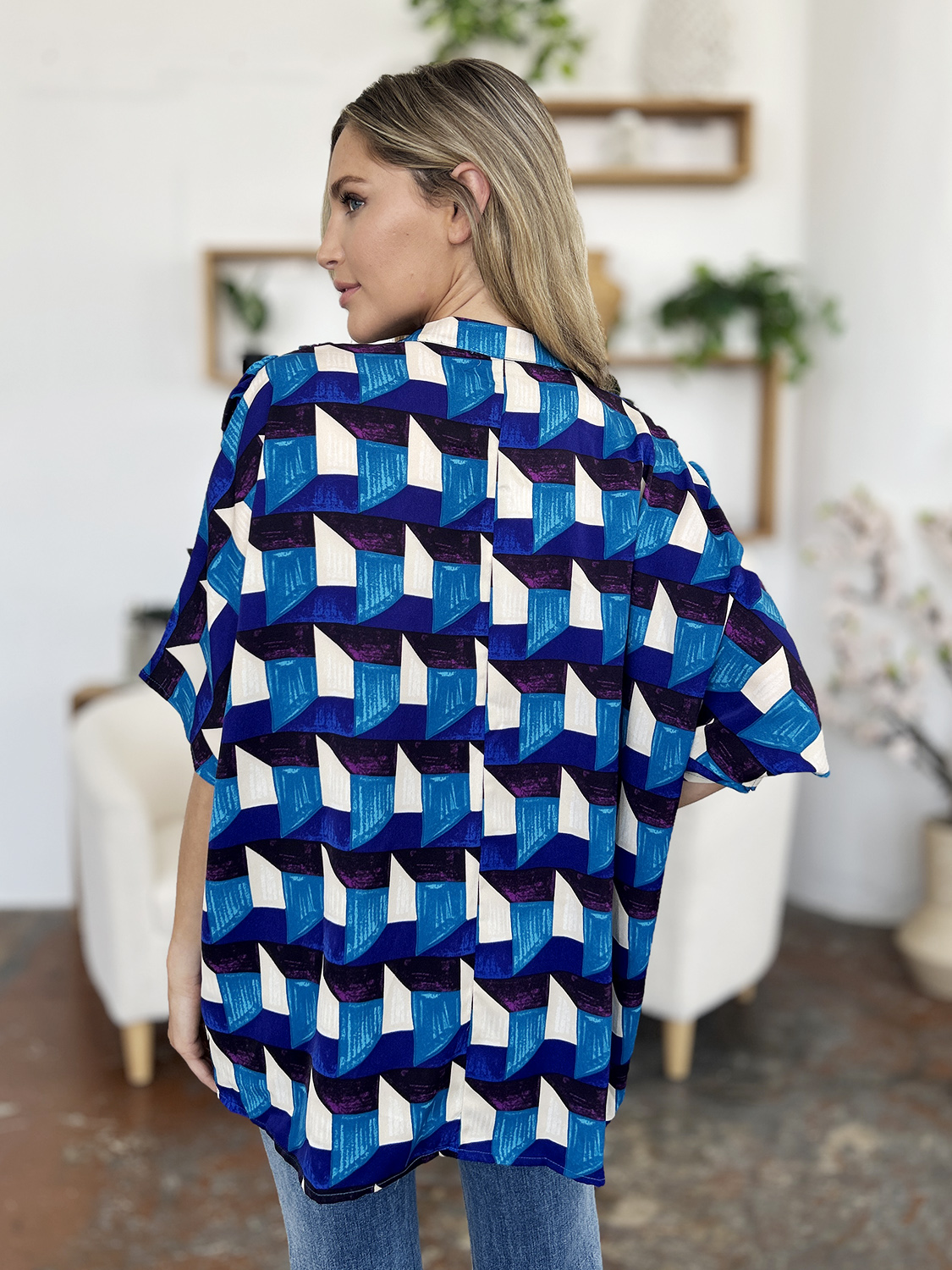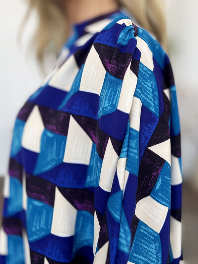 Full Size Geometric Notched Half Sleeve Blouse