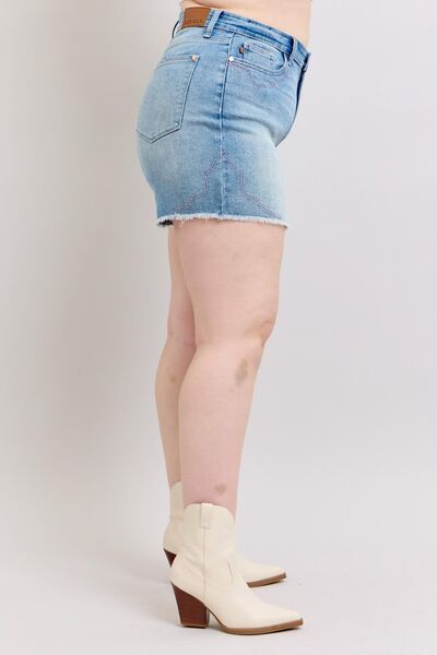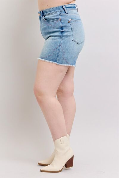 Full Size High Waist Western Embroidery Detail Cut Off Denim Shorts Plus Size