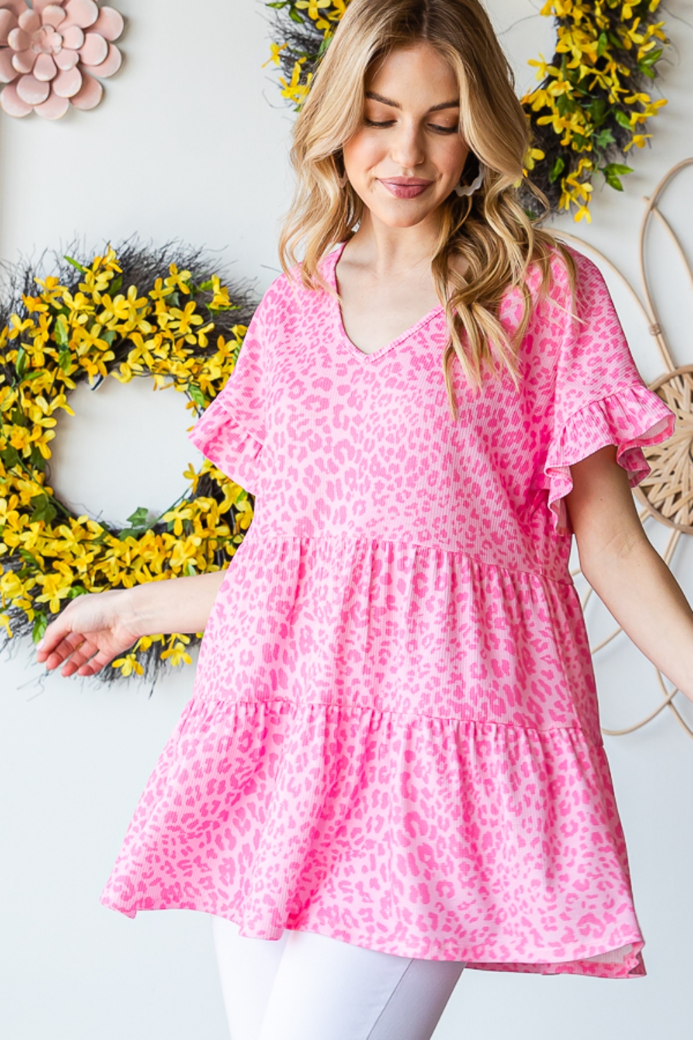 Full Size Leopard Ruffle Trim Short Sleeve Top