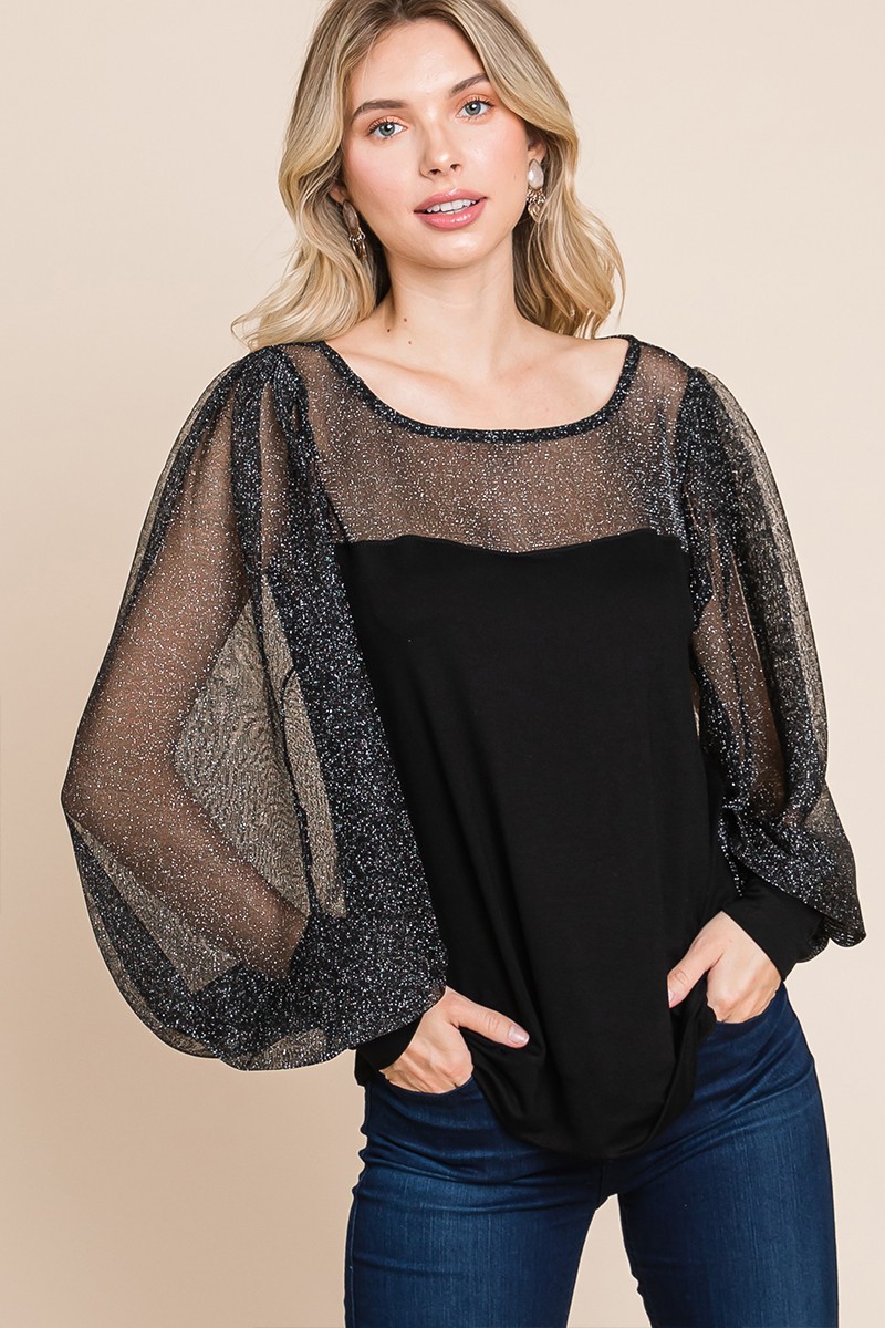 Full Size Metallic Mesh Lantern Sleeve Blouse