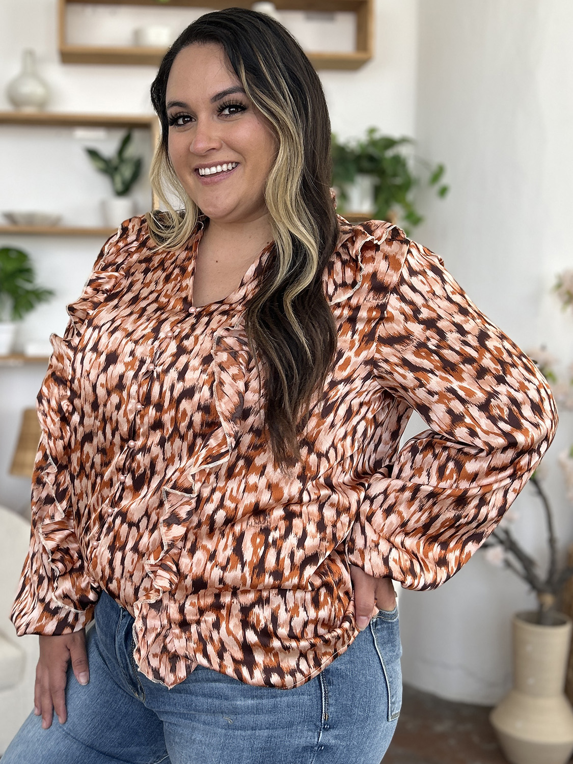 Full Size Printed Ruffle Trim Balloon Sleeve Shirt