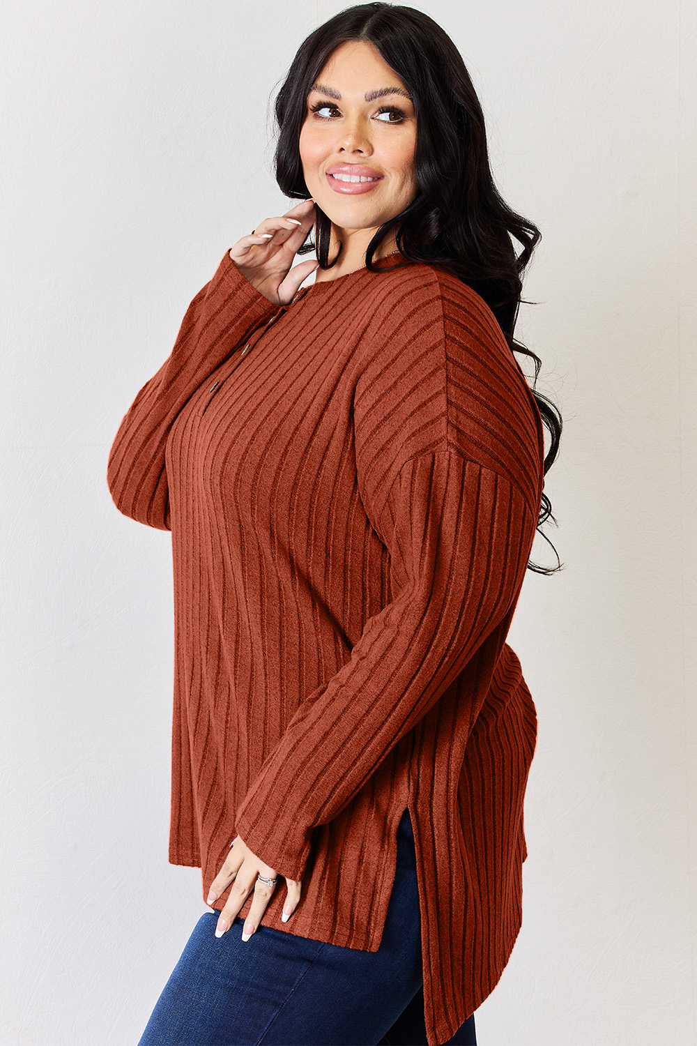 Full Size Ribbed Half Button Long Sleeve High-Low T-Shirt