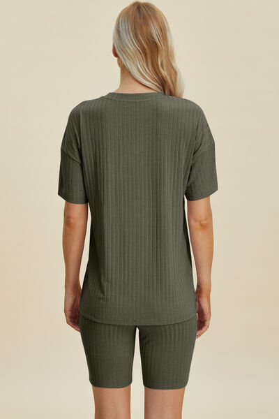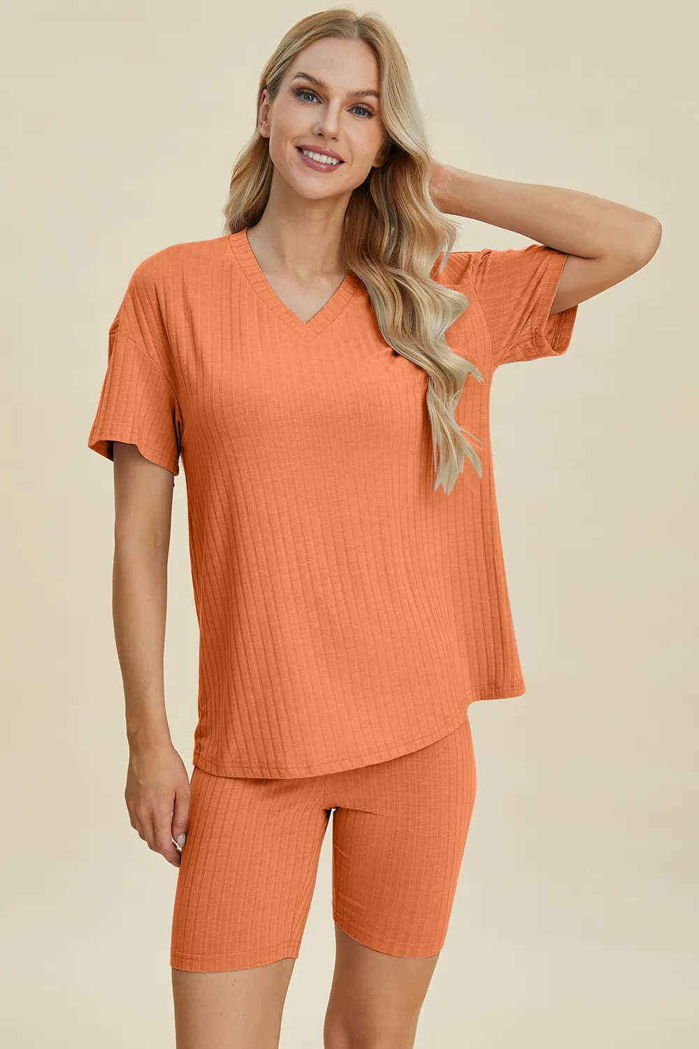 Full Size Ribbed V-Neck Short Sleeve Top and Shorts Set