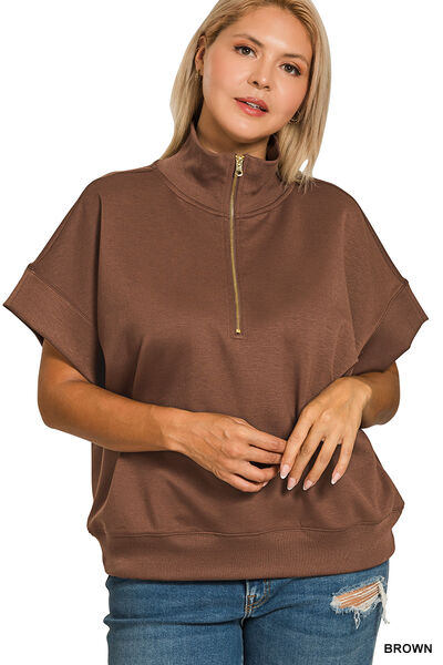 Full Size Scuba High Neck Half Zip Short Sleeve Top Plus Size