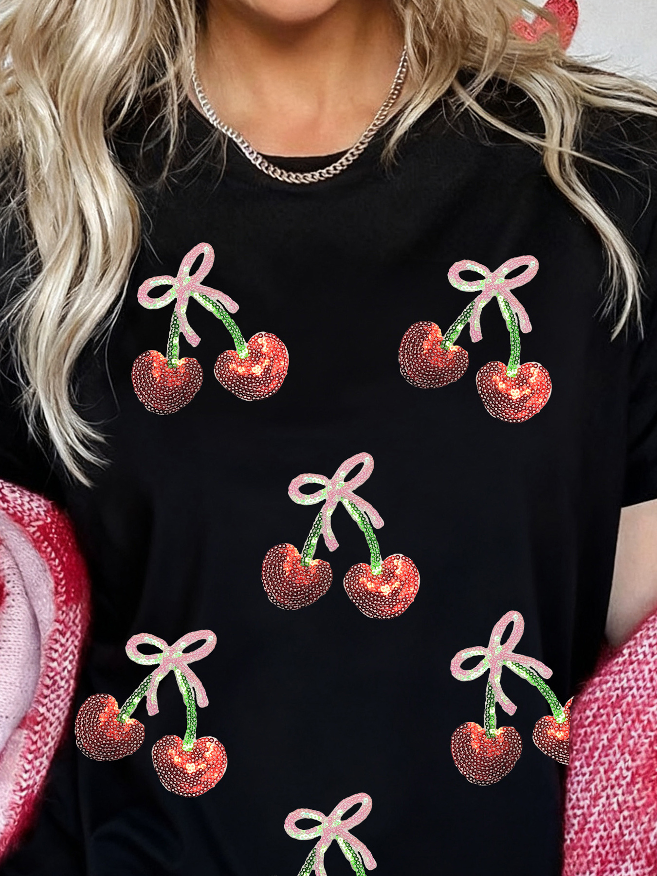 Full Size Sequin Bow Cheery Patched Valentines Tee Plus Size
