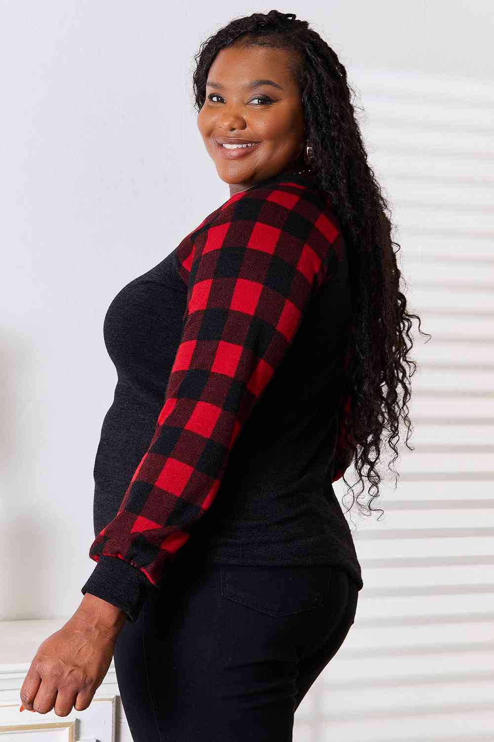 Full Size Sequin Reindeer Graphic Plaid Top