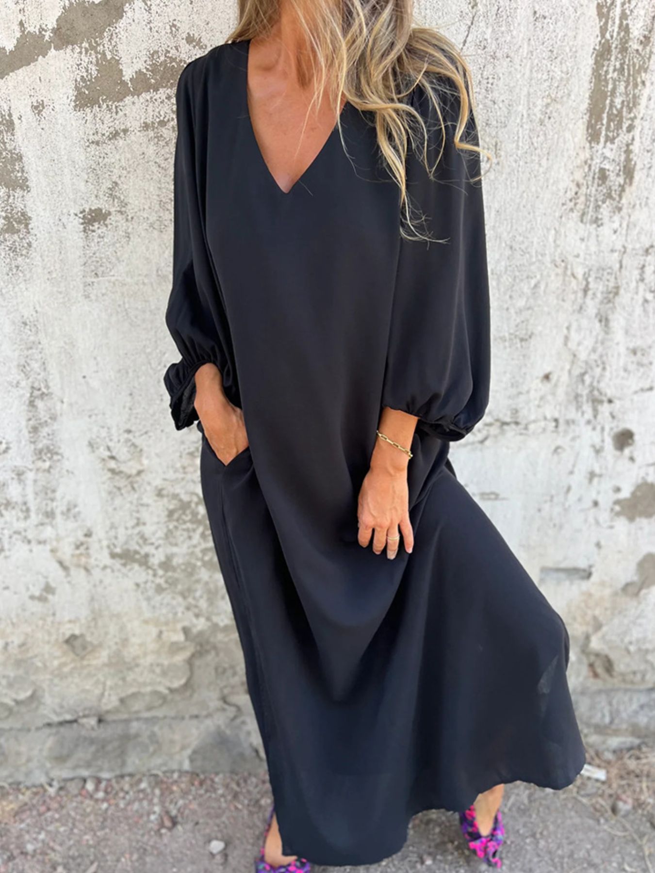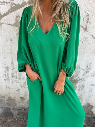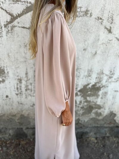 Full Size Slit V-Neck Balloon Sleeve Midi Dress Plus Size