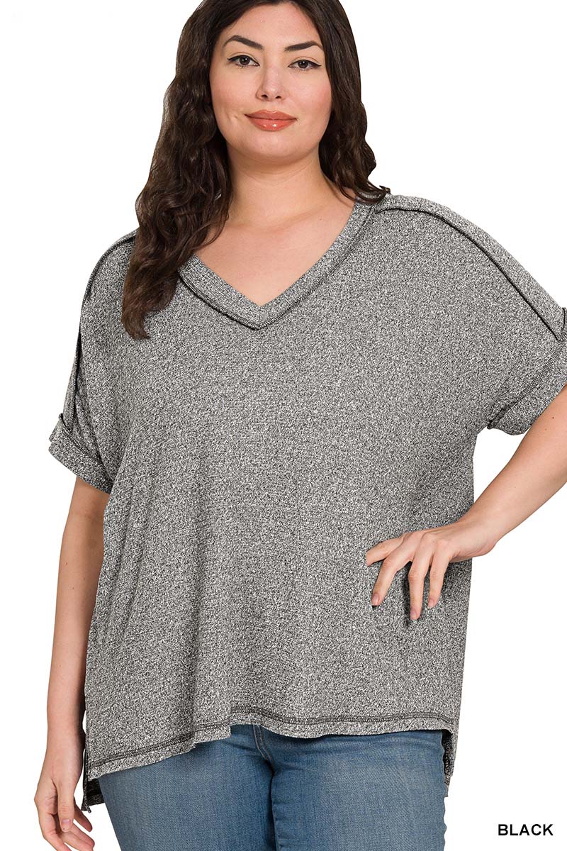 Full Size Soft Melange Hacci V-Neck Short Sleeve Hi-low Tee Plus Size