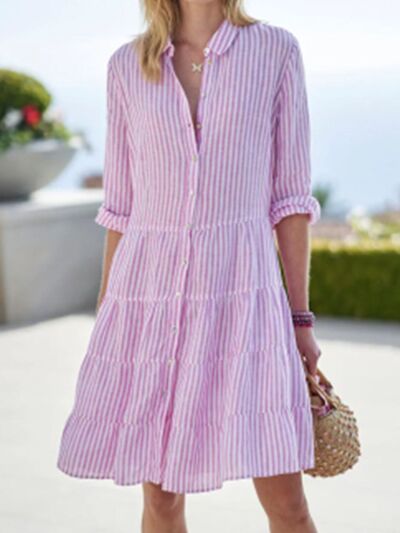 Full Size Striped Button-Down Shirt Dress with Tiered Ruffle Hem Plus Size