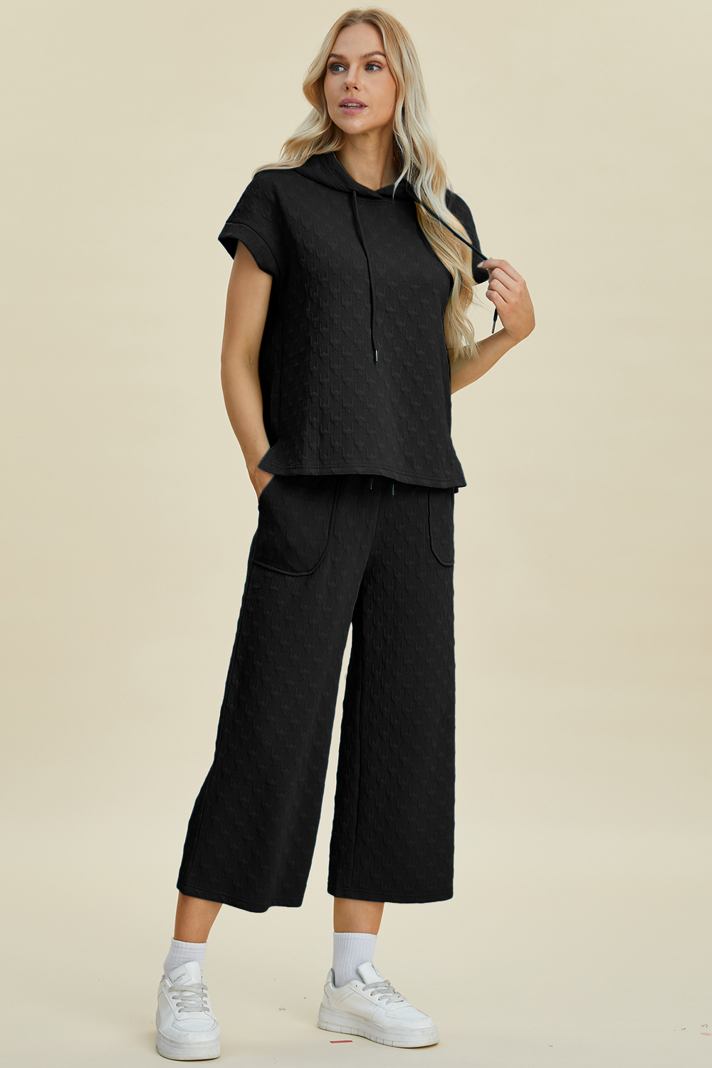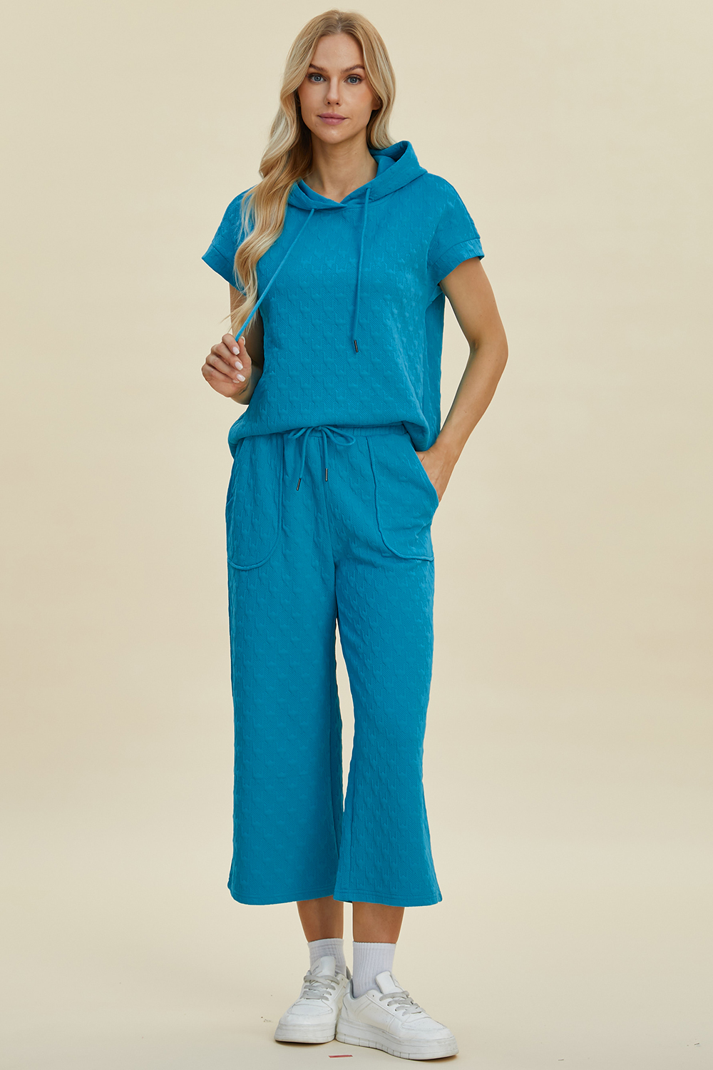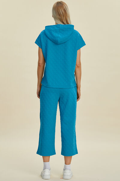 Full Size Texture Drawstring Short Sleeve Hoodie and Pocketed Pants Set
