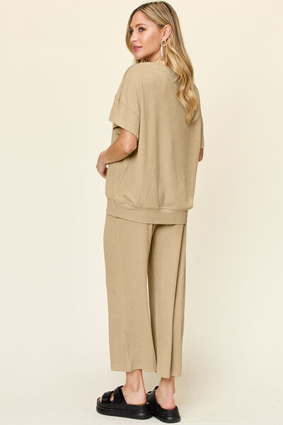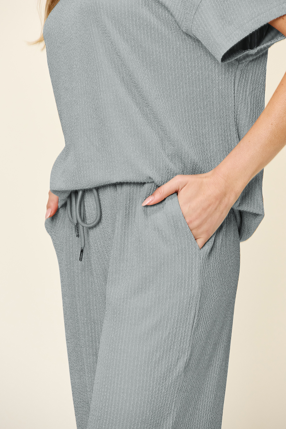Full Size Texture Round Neck Short Sleeve T-Shirt and Wide Leg Pants