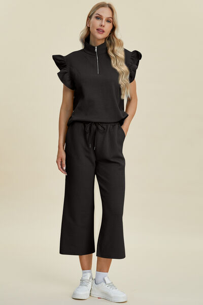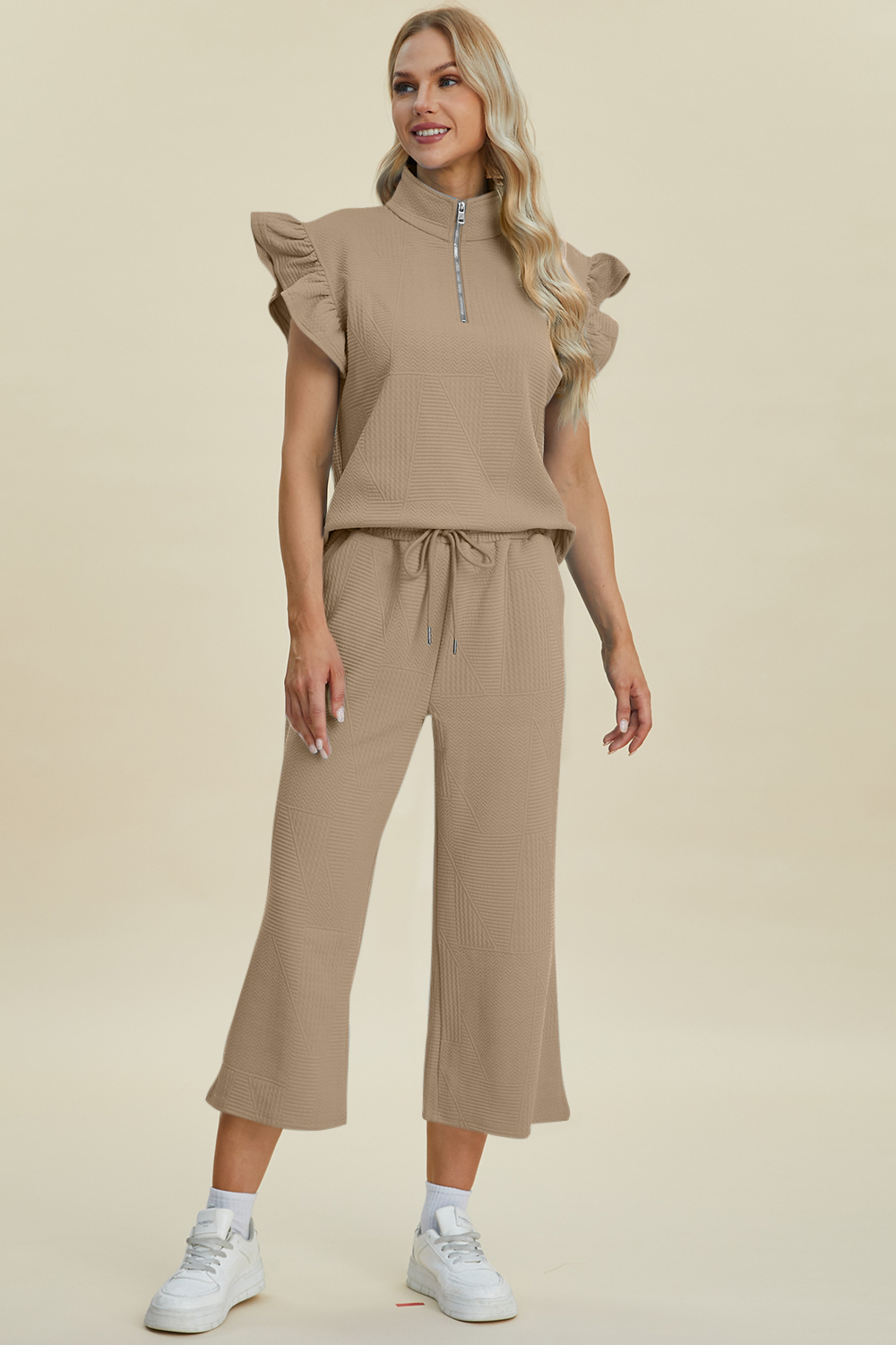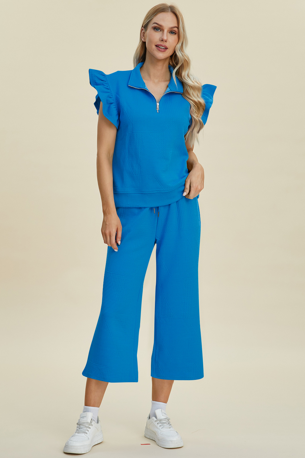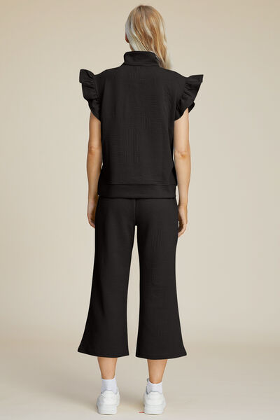 Full Size Texture Ruffle Short Sleeve Top and Wide Leg Pants Set