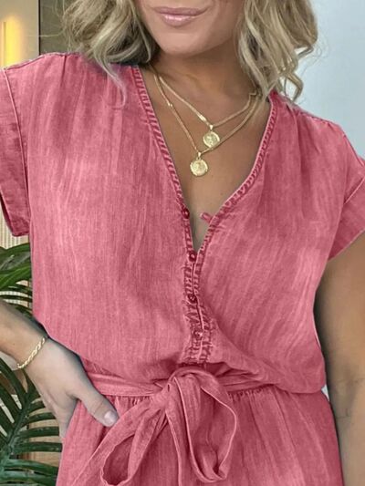Full Size Tie Waist Cap Sleeve Denim Romper Plus Size