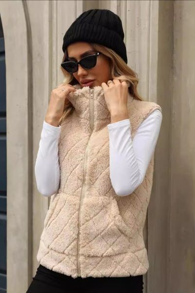 Fuzzy Plaid Texture Zip Up Vest Coat