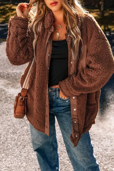 Fuzzy Snap Down Dropped Shoulder Jacket