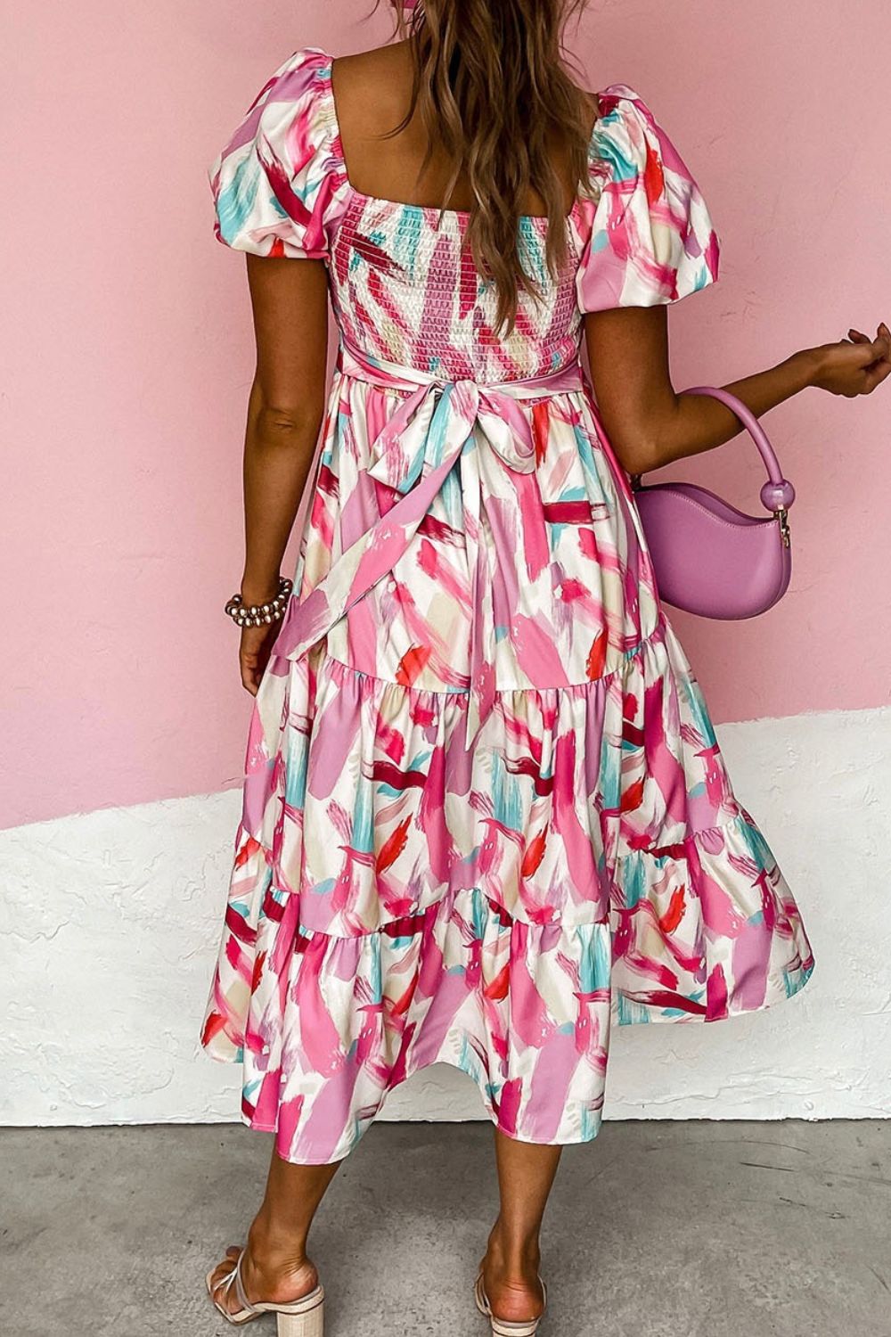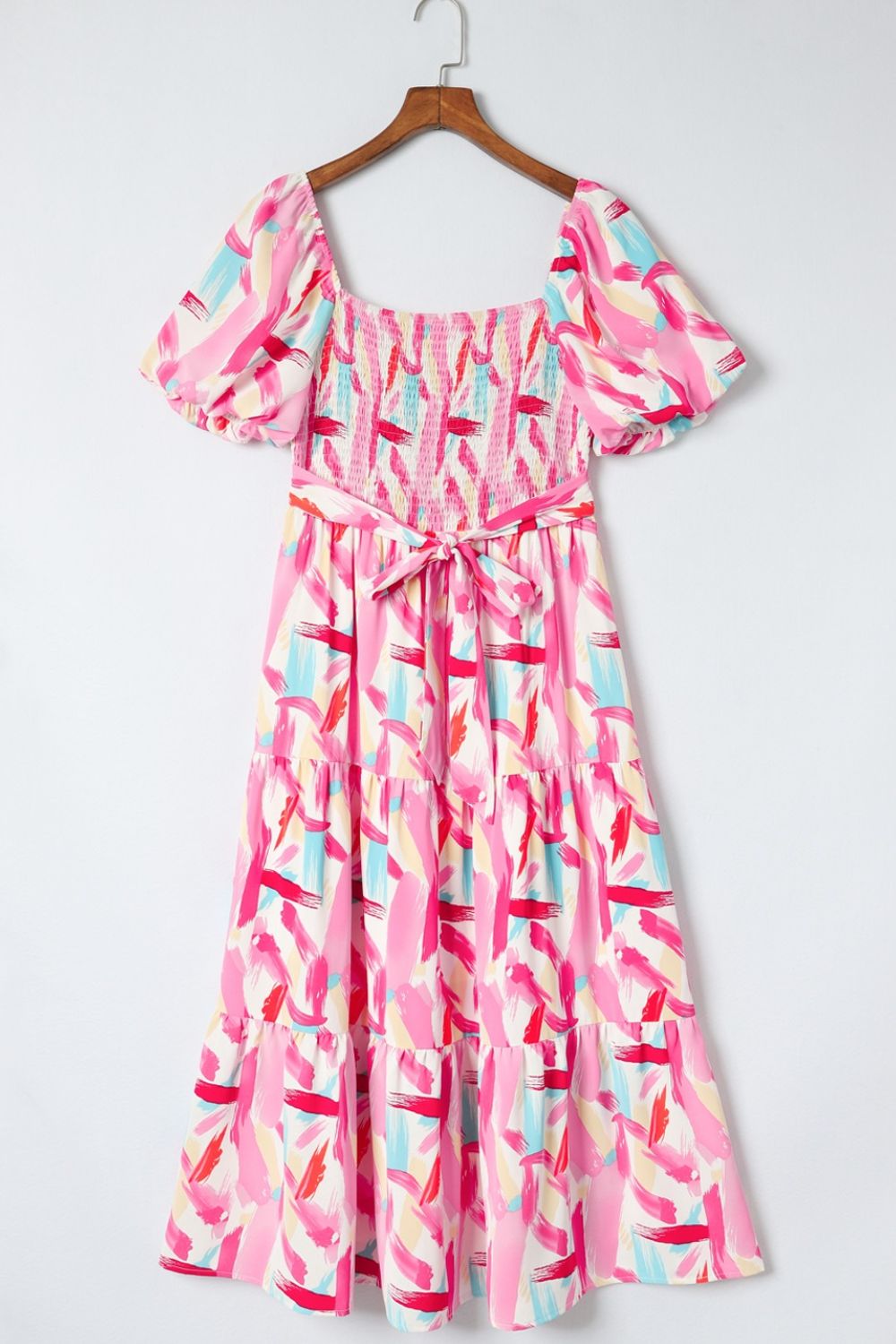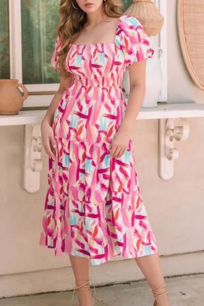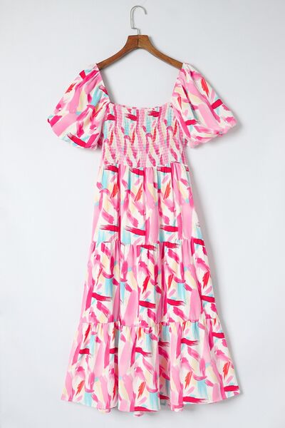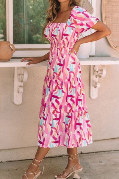 Geometric Print Puff Sleeve Square Neck Midi Dress