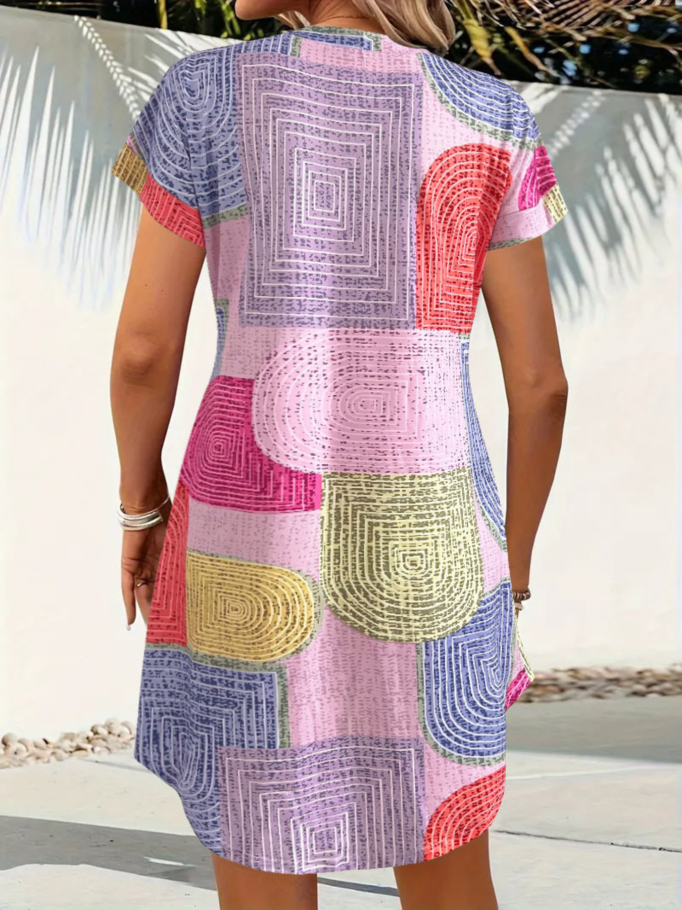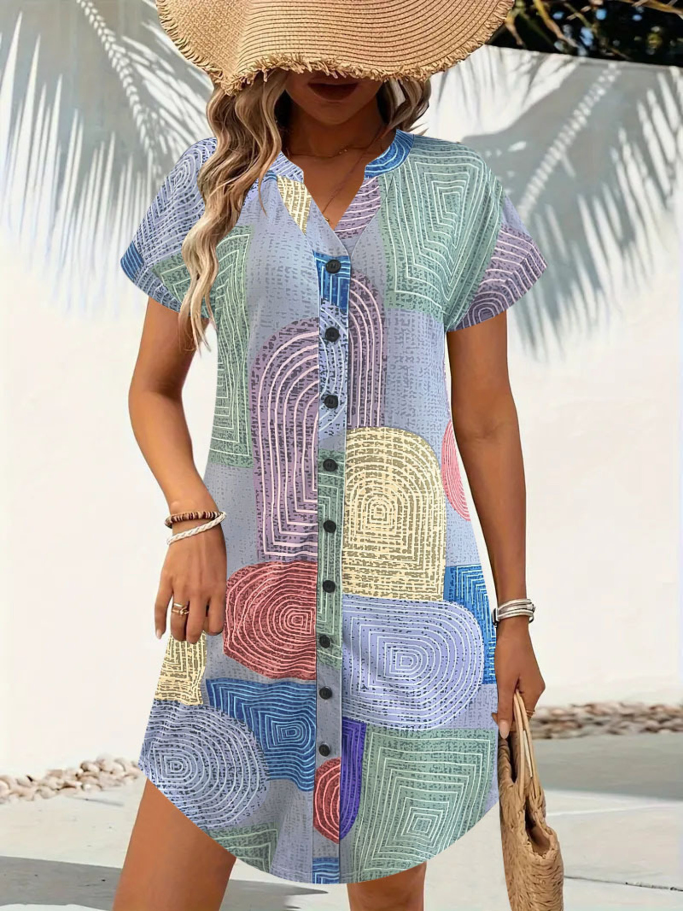 Geometric V-Neck Short Sleeve Button-Front Dress