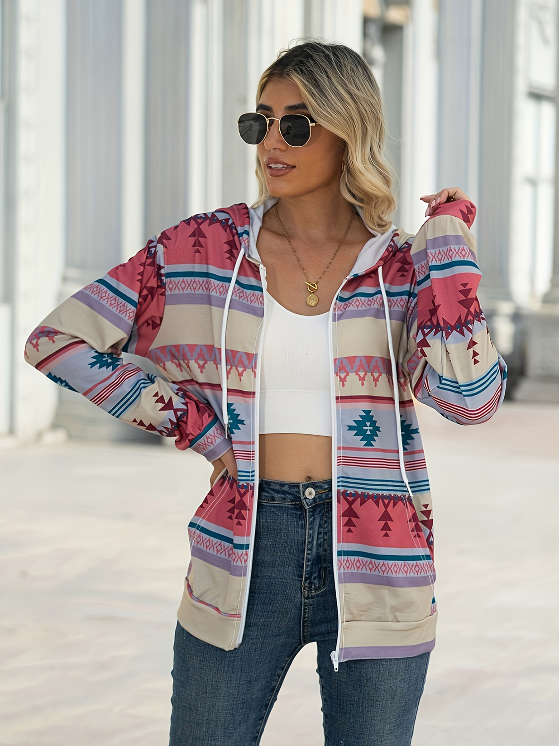 Geometric Zip Up Long Sleeve Hooded Jacket