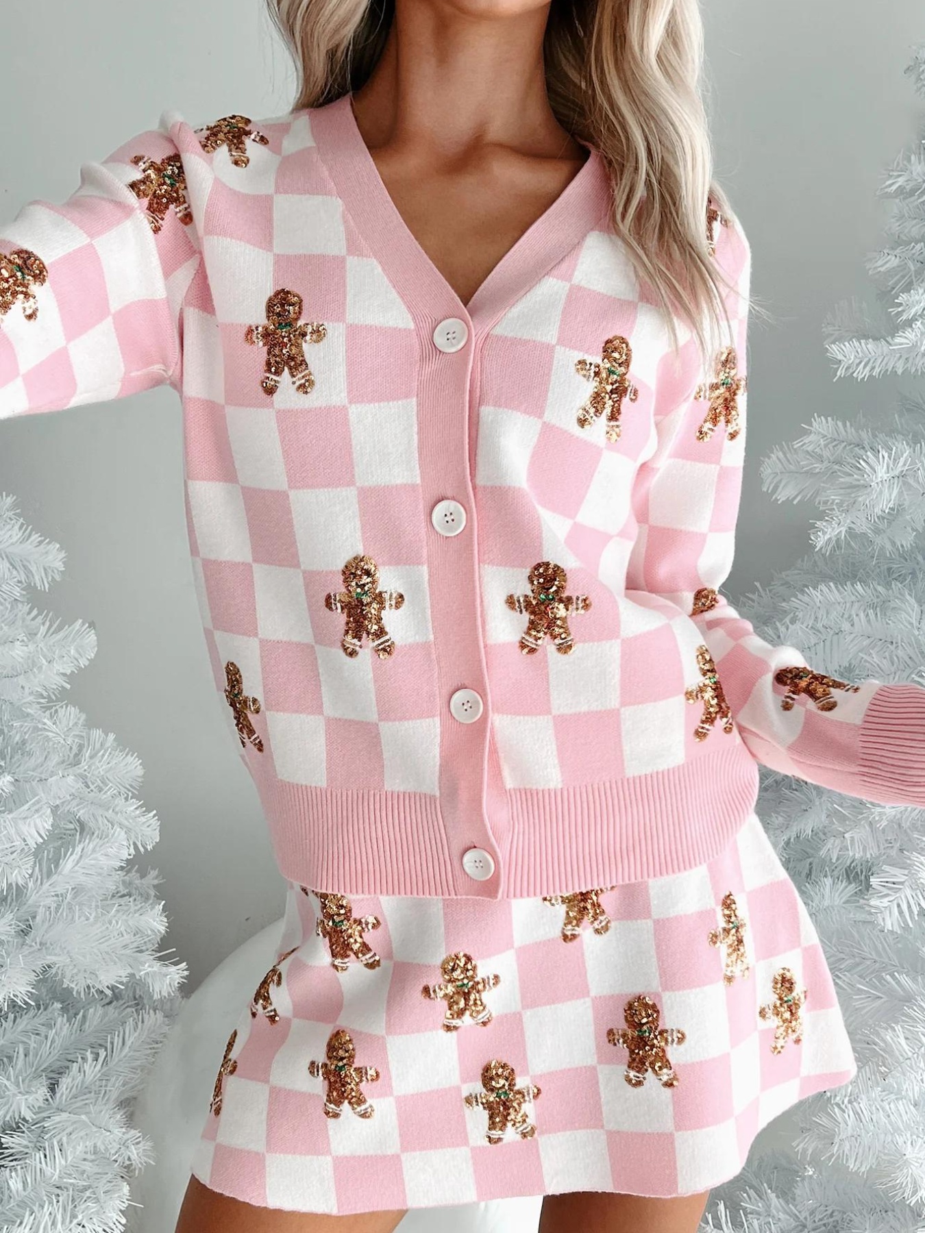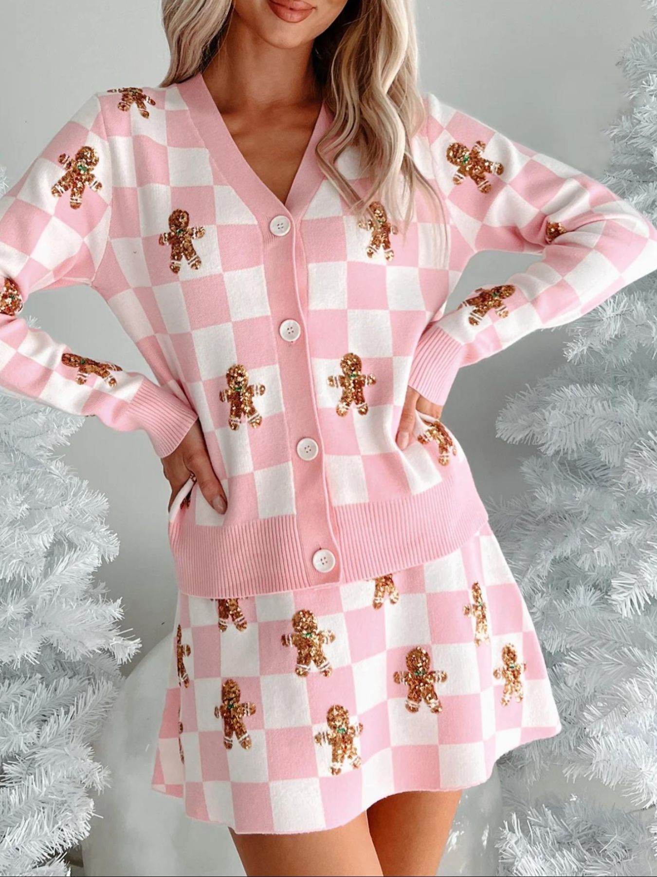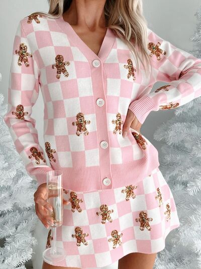Gingerbread Checkered Cardigan and Skirt Sweater Set