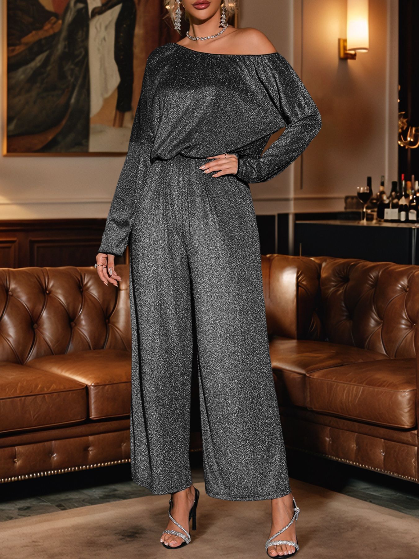 Glitter One Shoulder Long Sleeve Wide Leg Jumpsuit