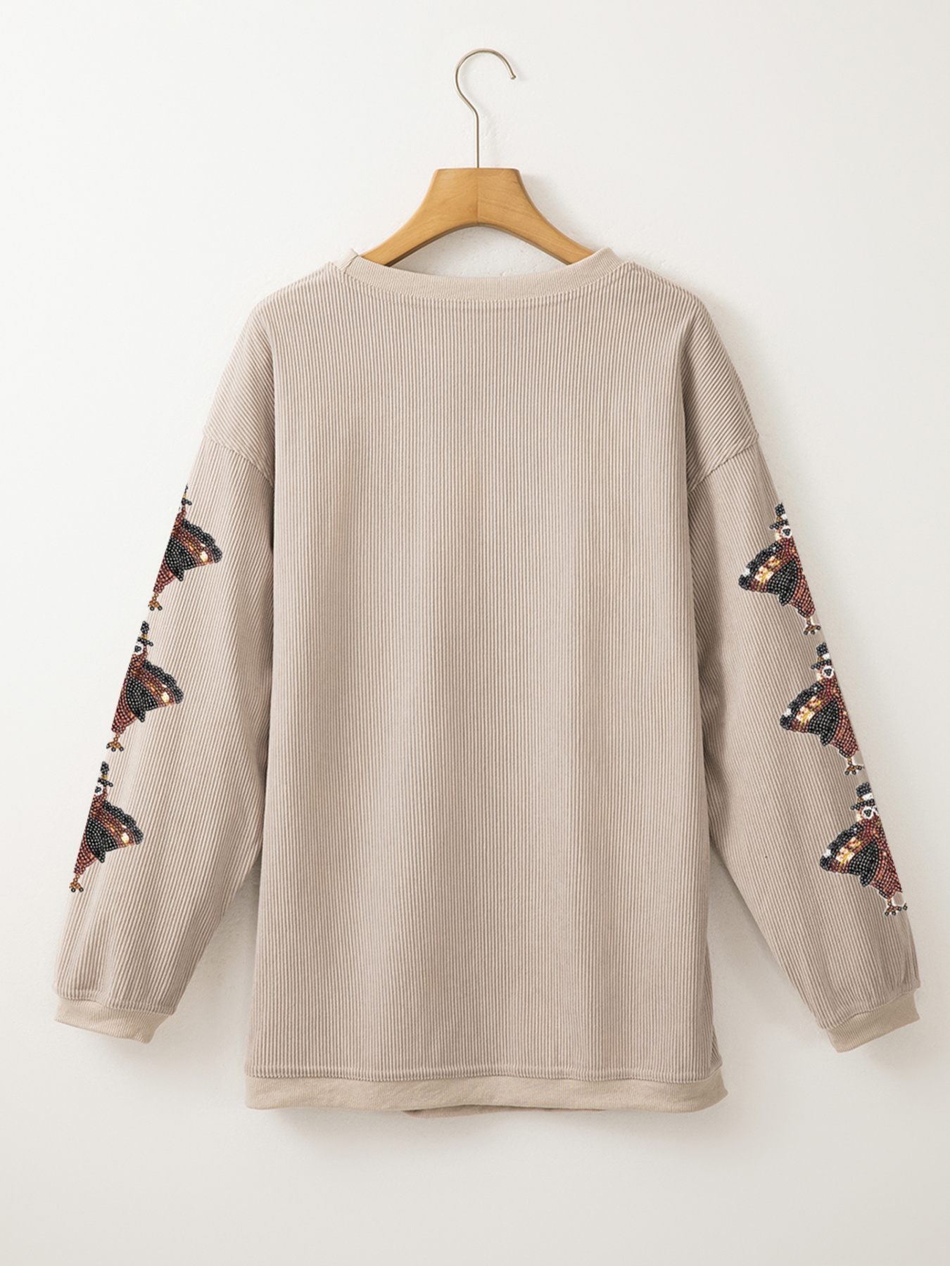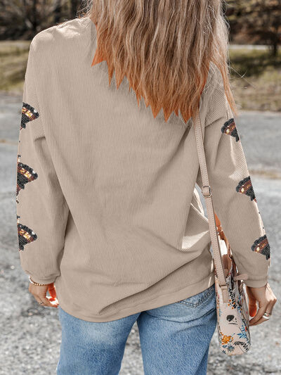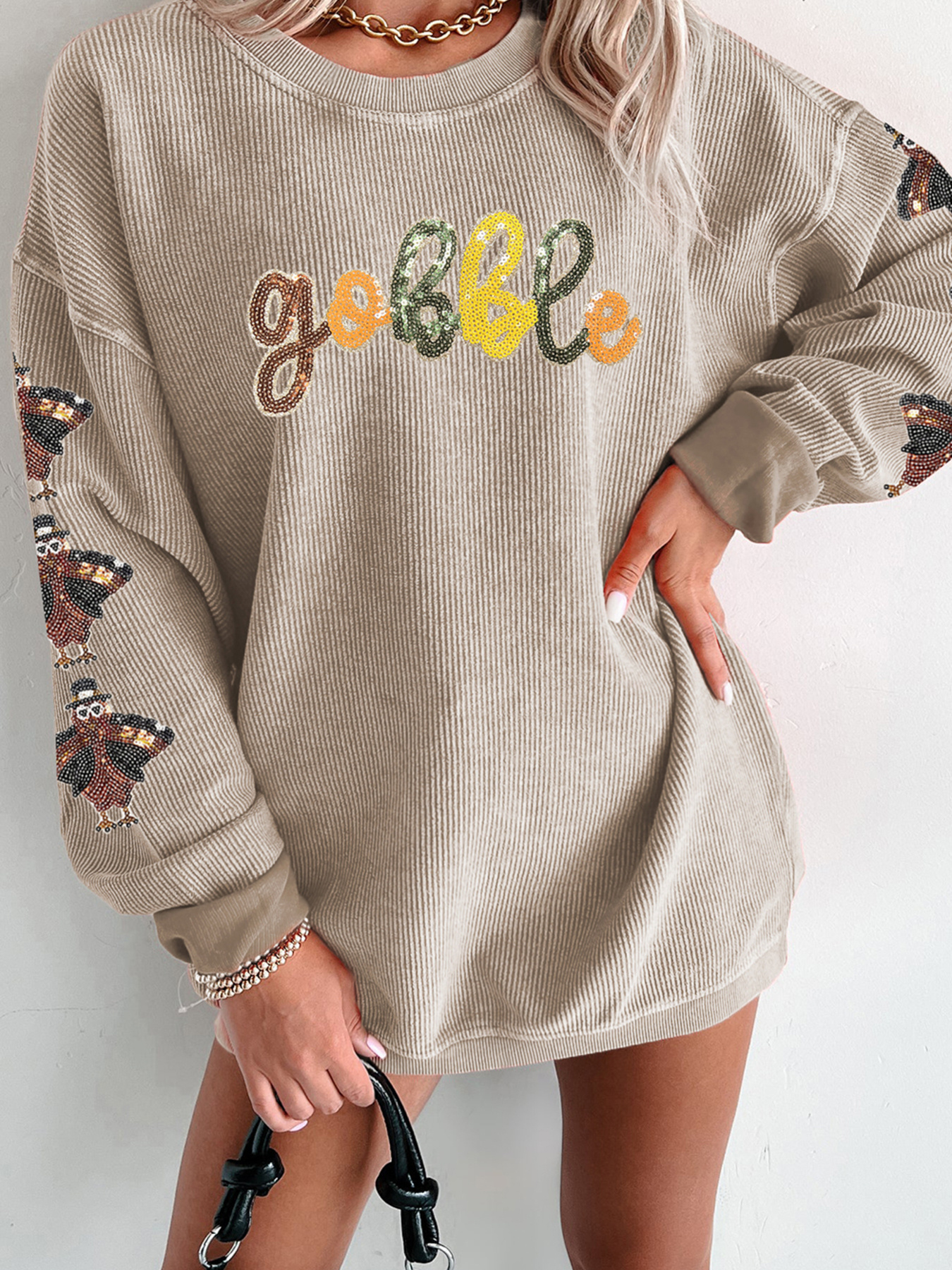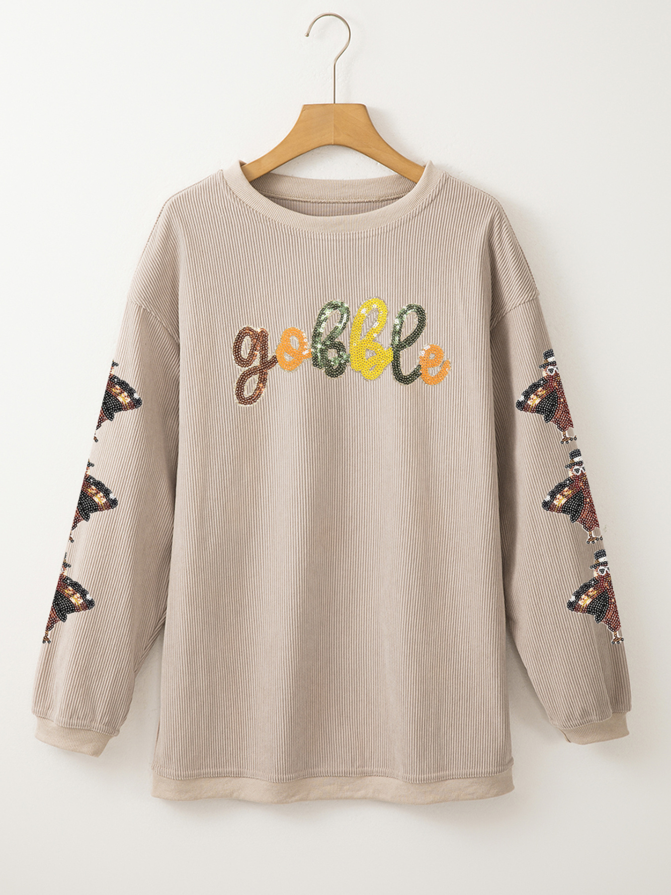 Gobble Corded Ribbed Thanksgiving Turkey Sequin Patched Sleeve Sweatshirt