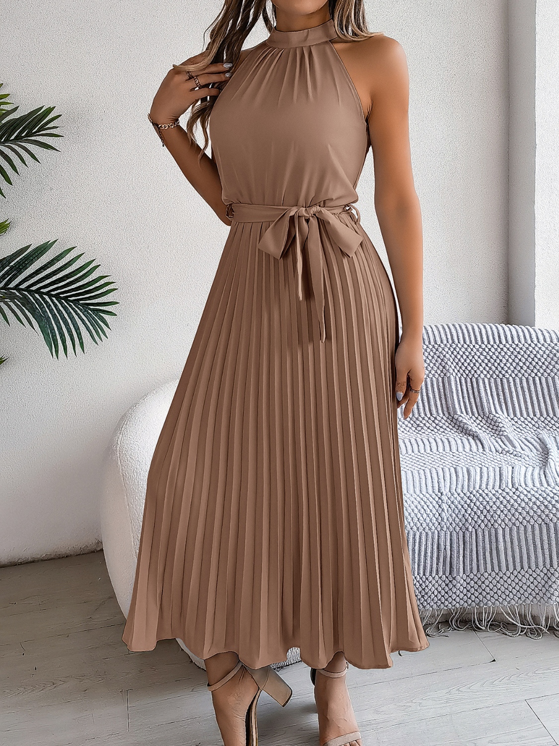 Grecian Neck Tie Waist Pleated Dress
