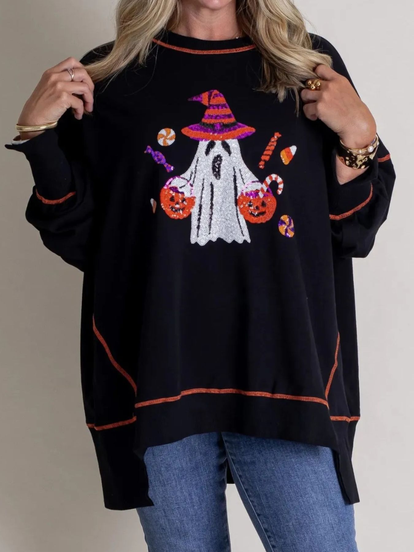 Halloween Ghost Sequin Exposed Seam Sweatshirt