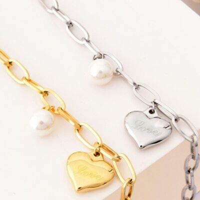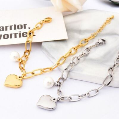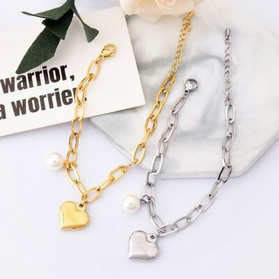 Heart Charm Pearl Accent Chain Bracelet