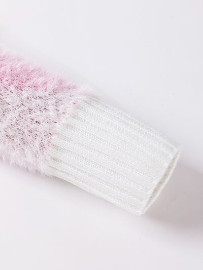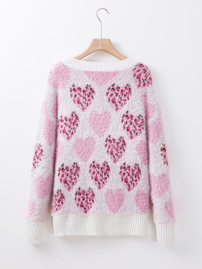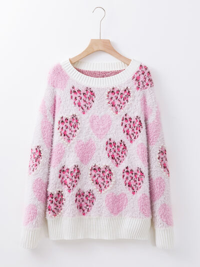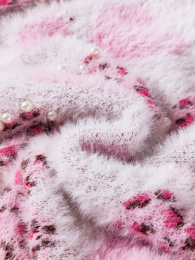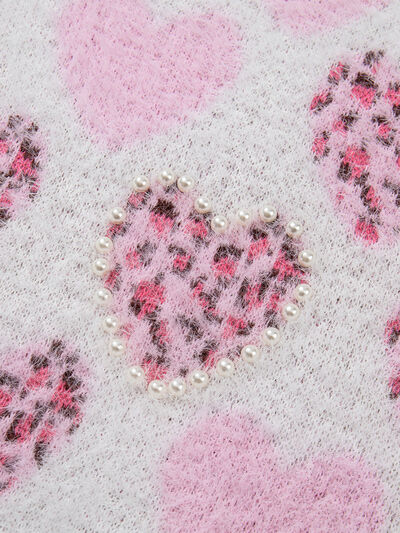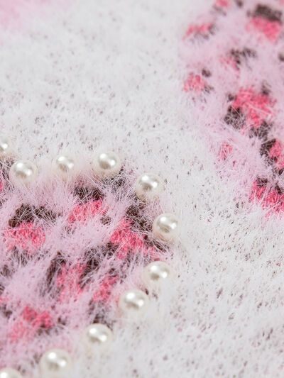 Heart Leopard Pearled Ribbed Trim Fuzzy Sweater