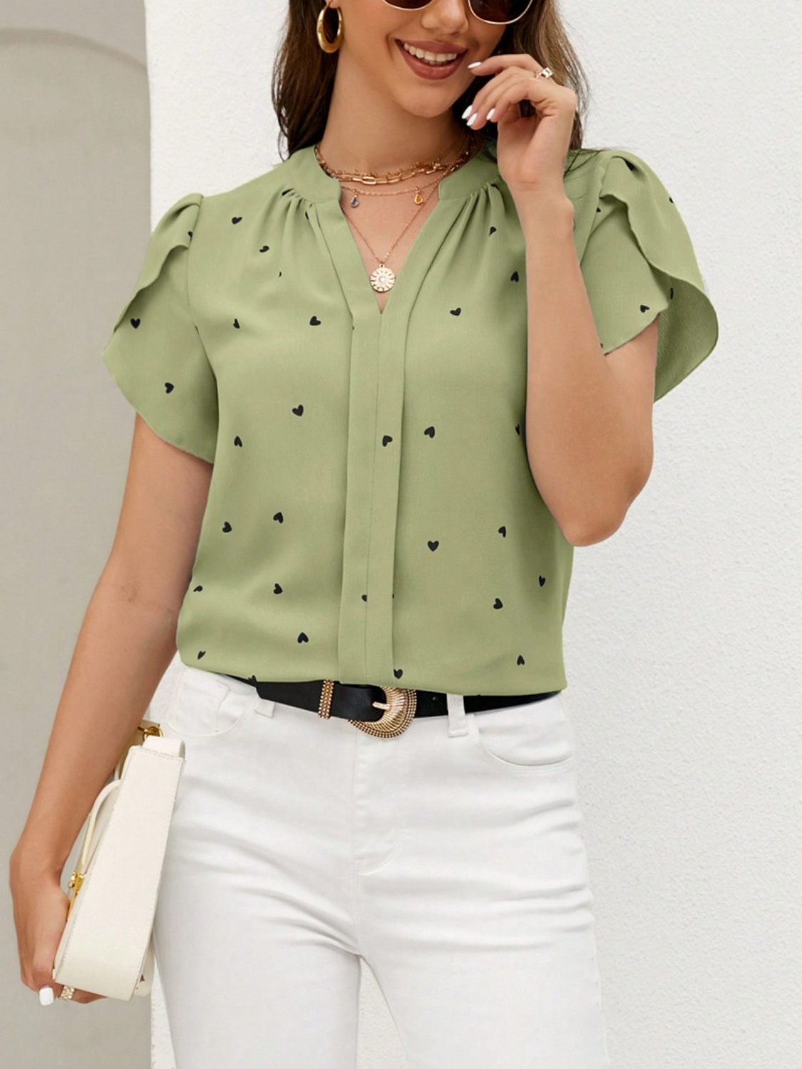Heart Print Notched Petal Sleeve Blouse