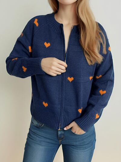 Heart Round Neck Zip Up Cardigan