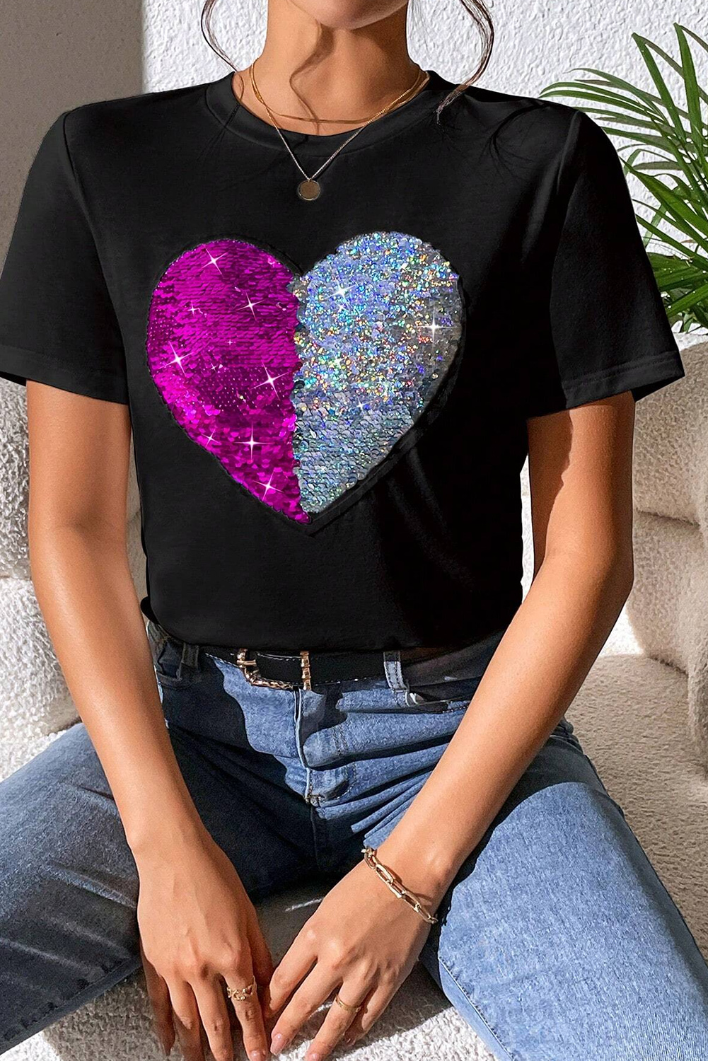 Heart Sequin Round Neck Short Sleeve T-Shirt