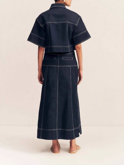 High-Waist Side Slit Contrast Stitch Denim Maxi Skirt