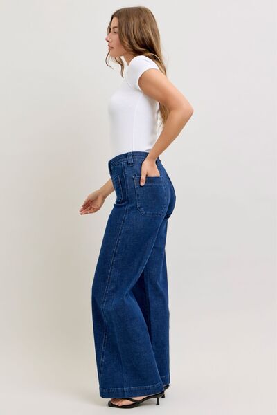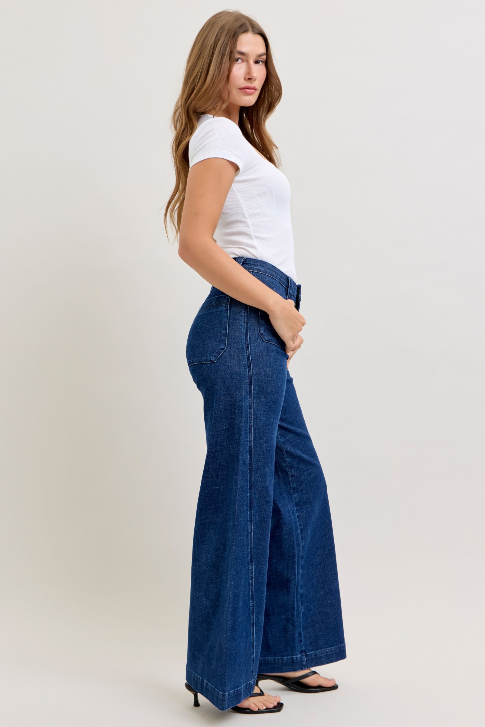High-Waisted Retro Wide Jeans with Patch Pkts & Twisted Seams
