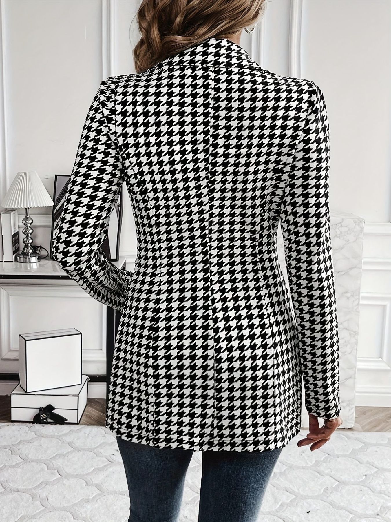 Houndstooth Print Lapel Collar Blazer