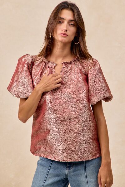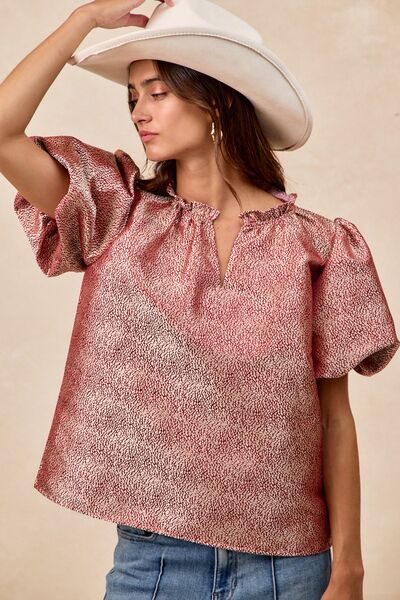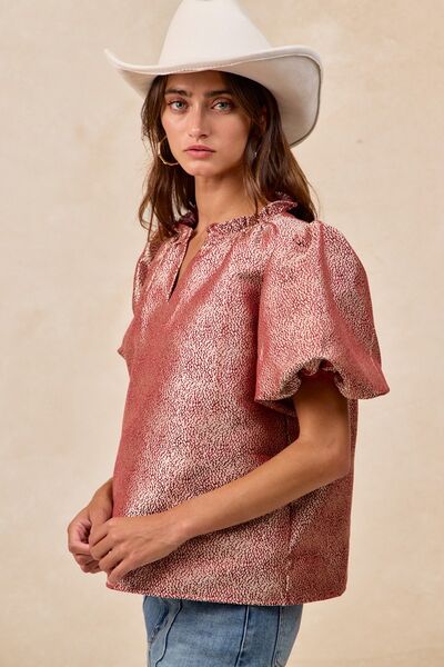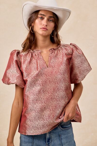 Jacquard Woven Short Balloon Sleeves V Neck Top
