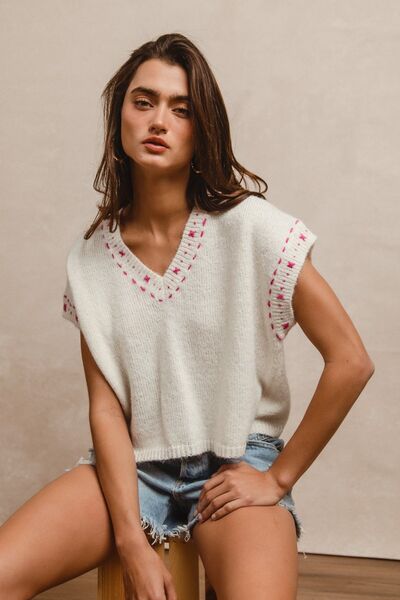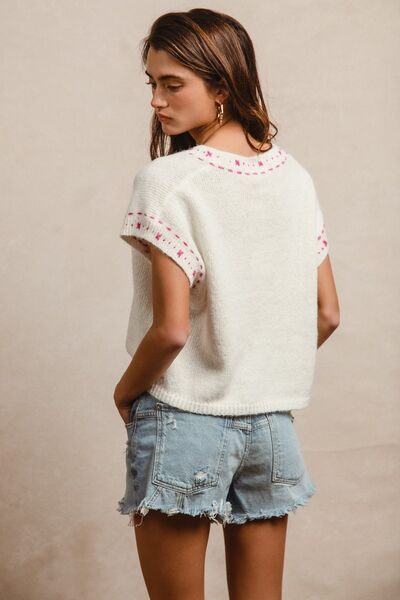 Knit Solid Contrast Stitch Detail Short Sleeves Sweater