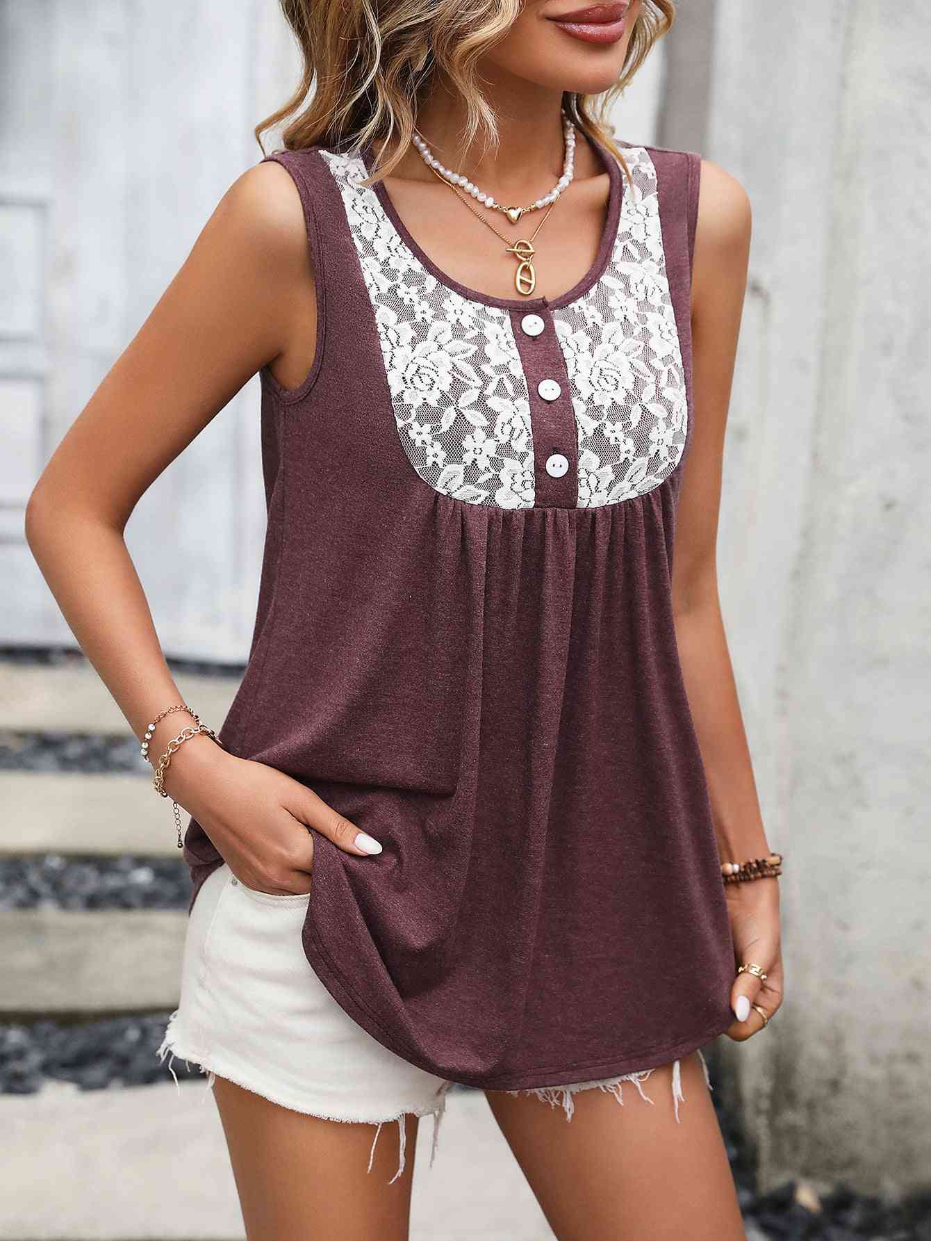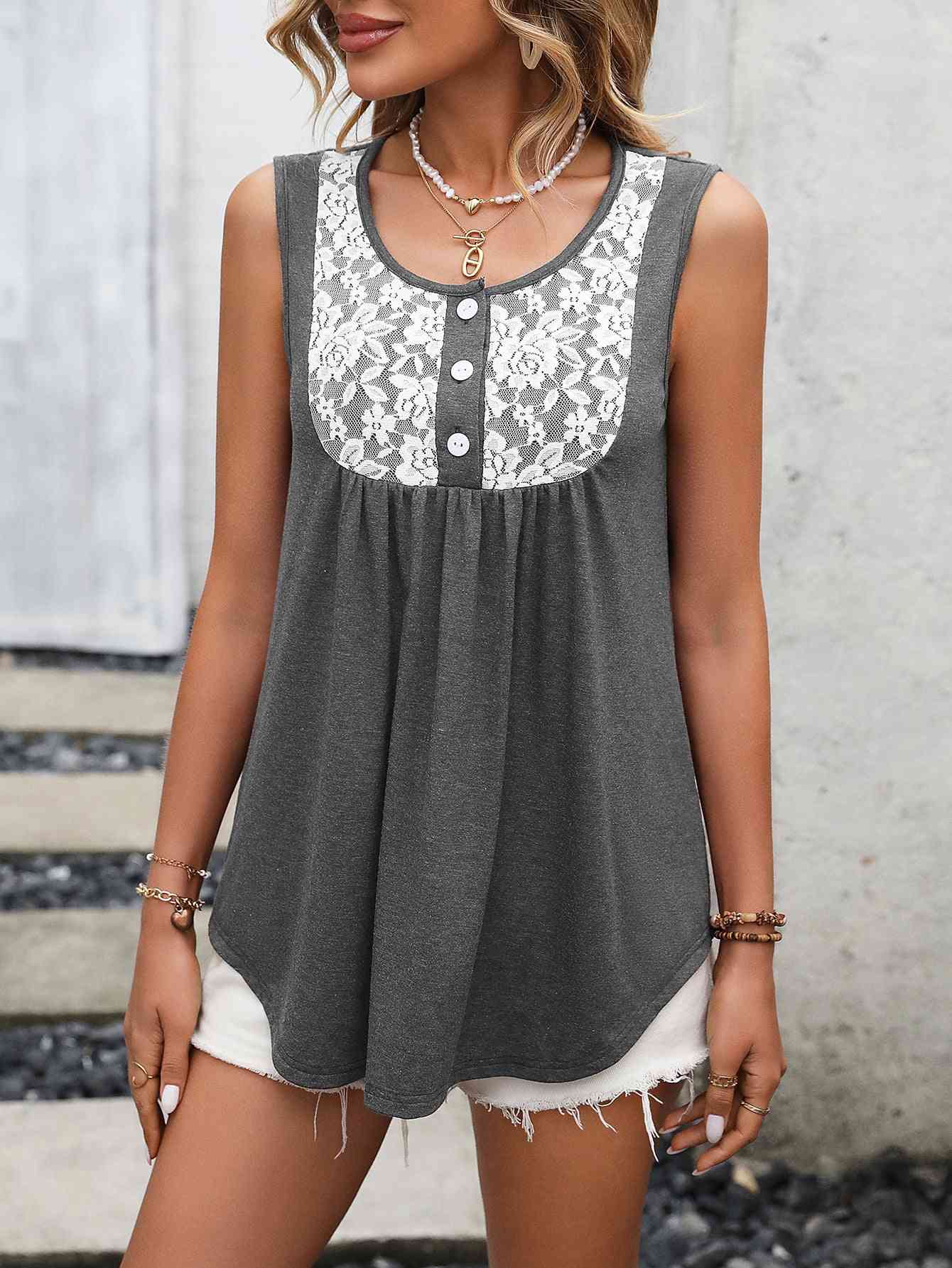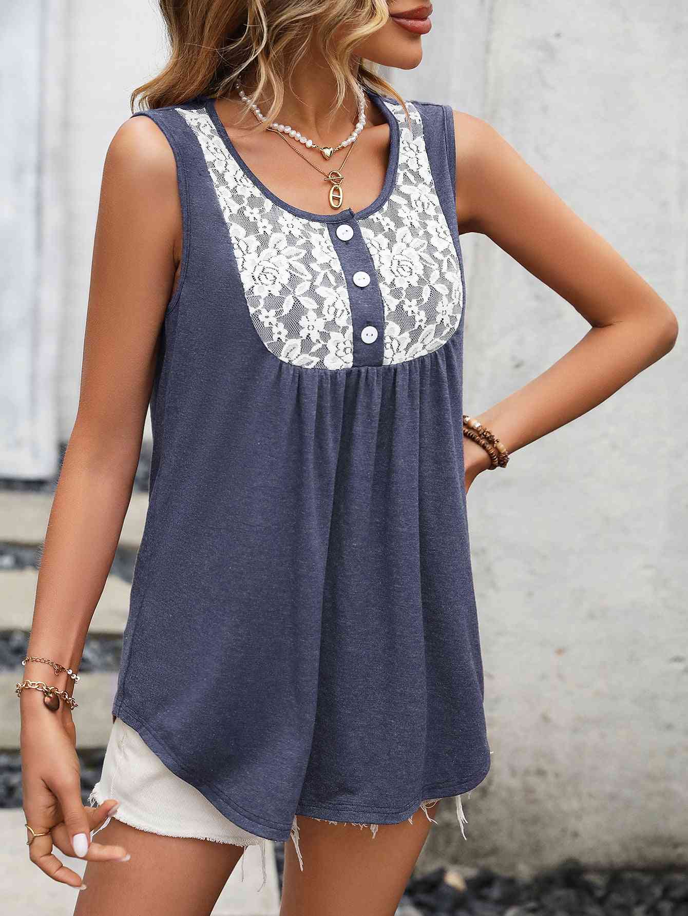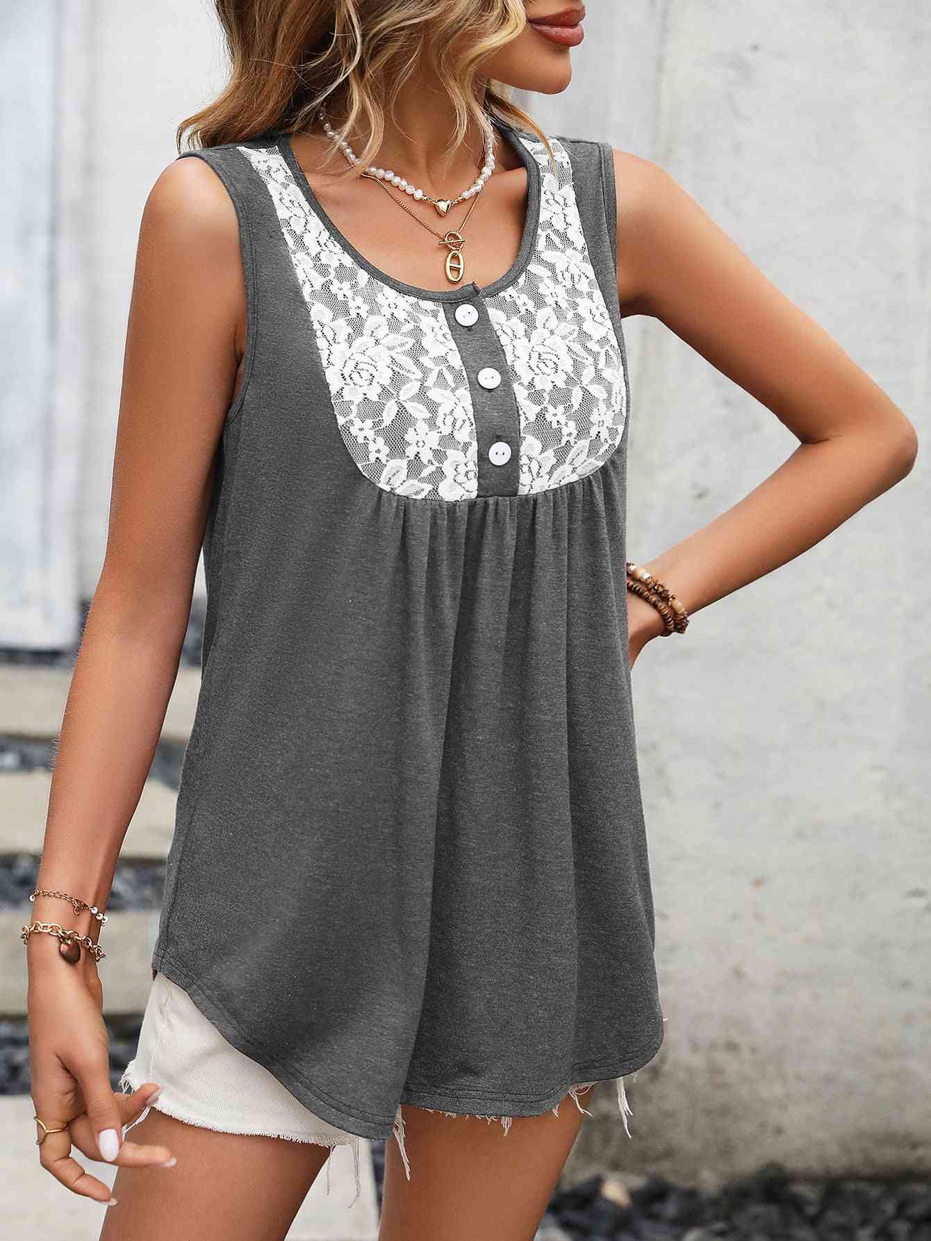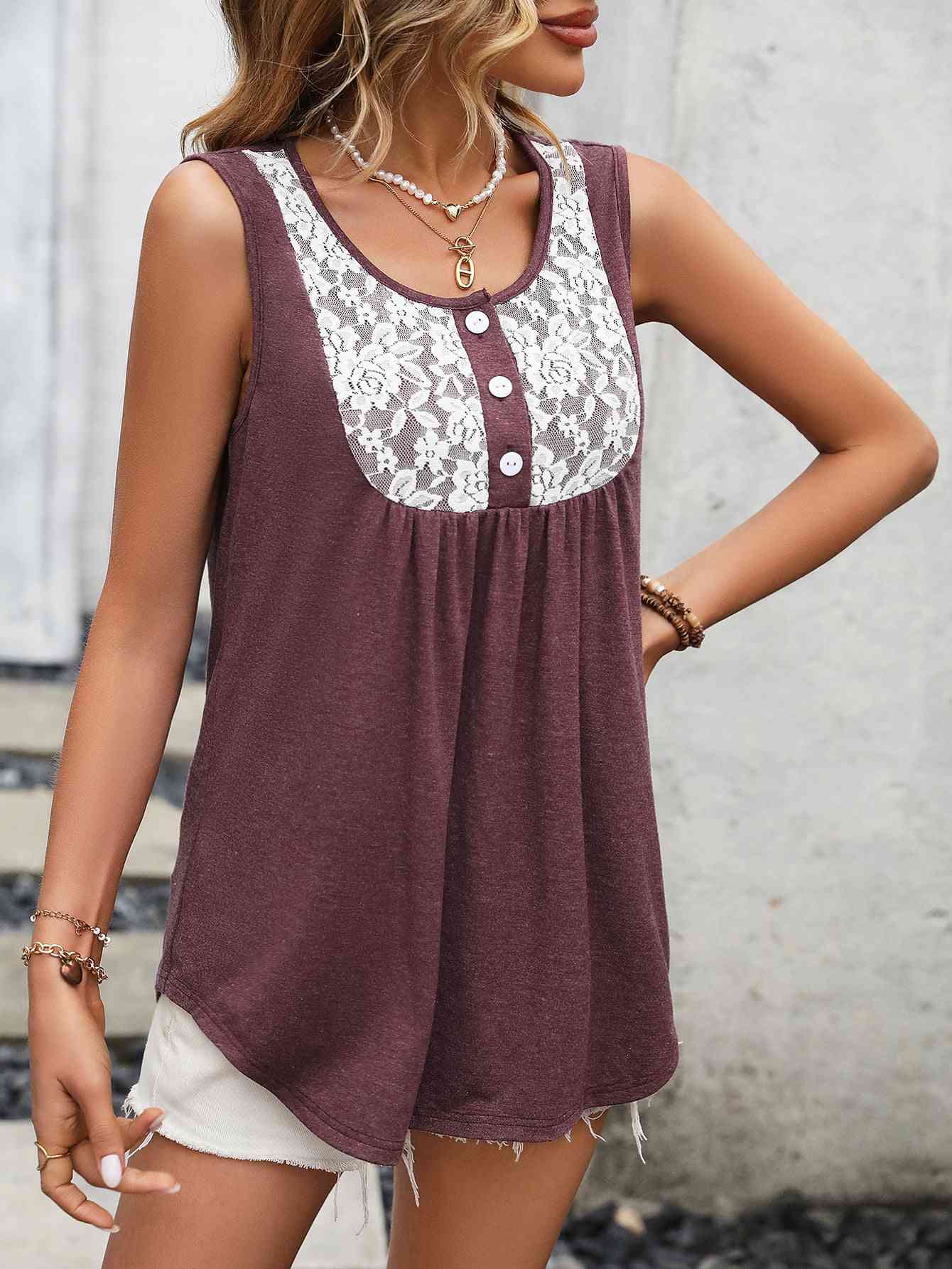 Lace Contrast Scoop Neck Tank