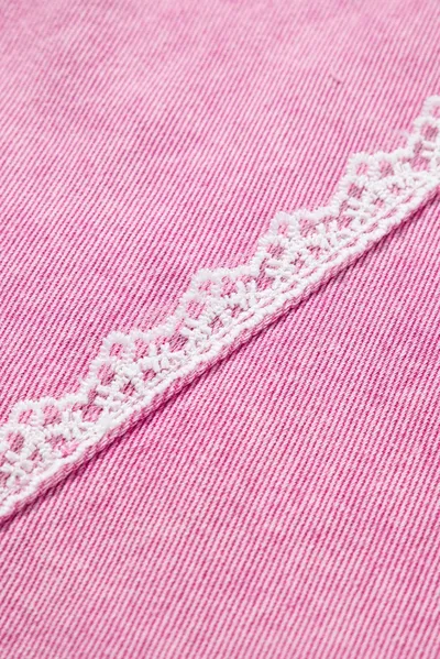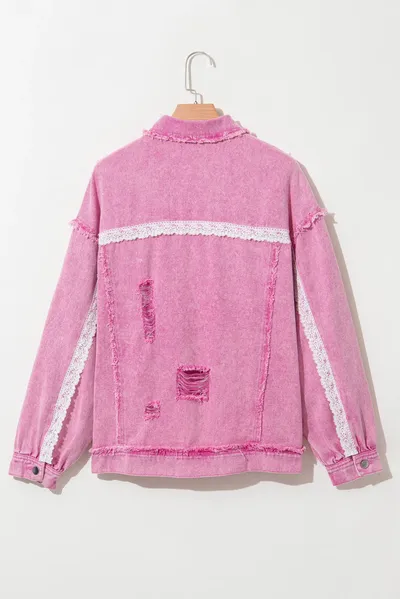 Lace Detail Distressed Raw Hem Long Sleeve Denim Jacket