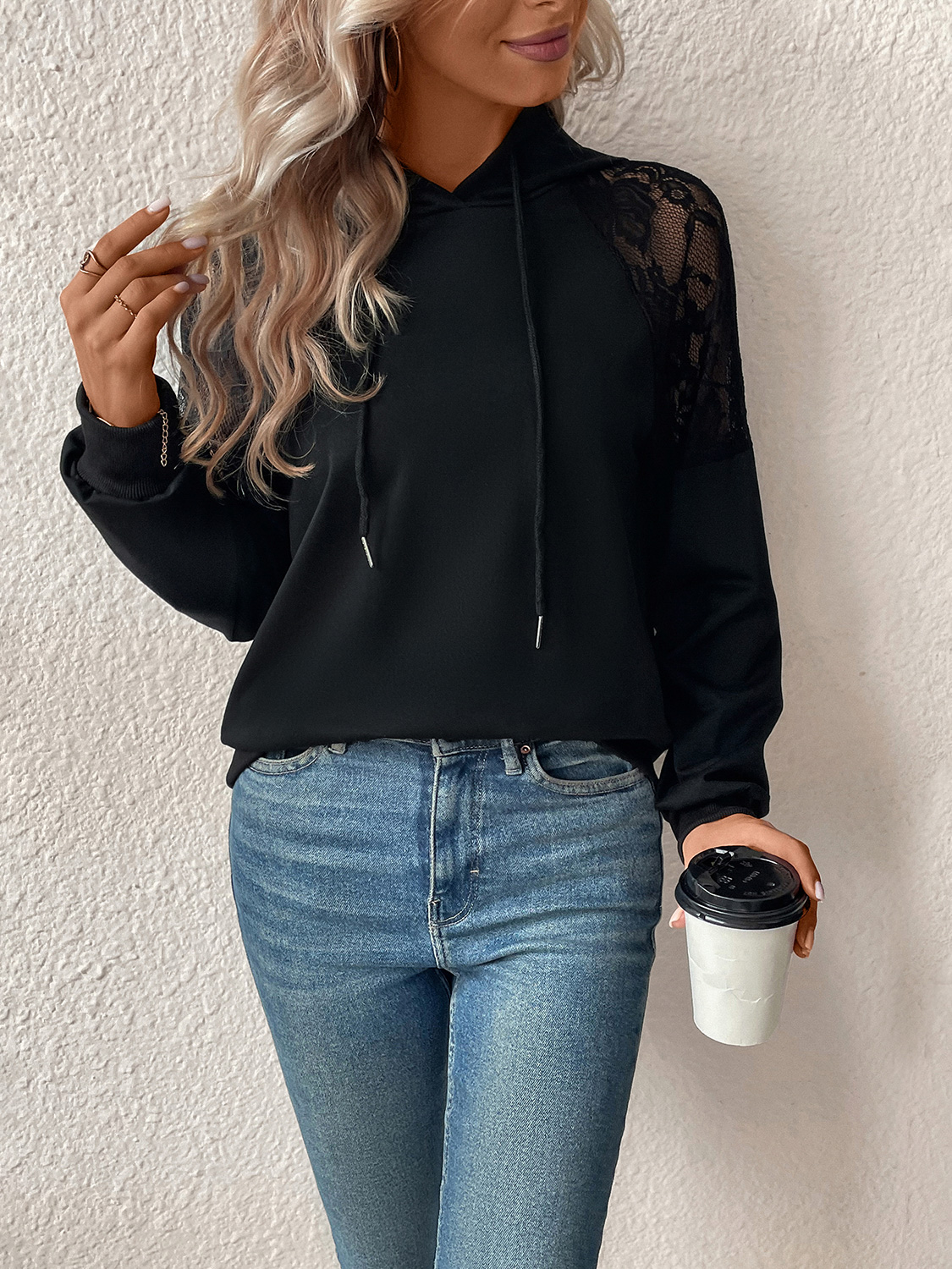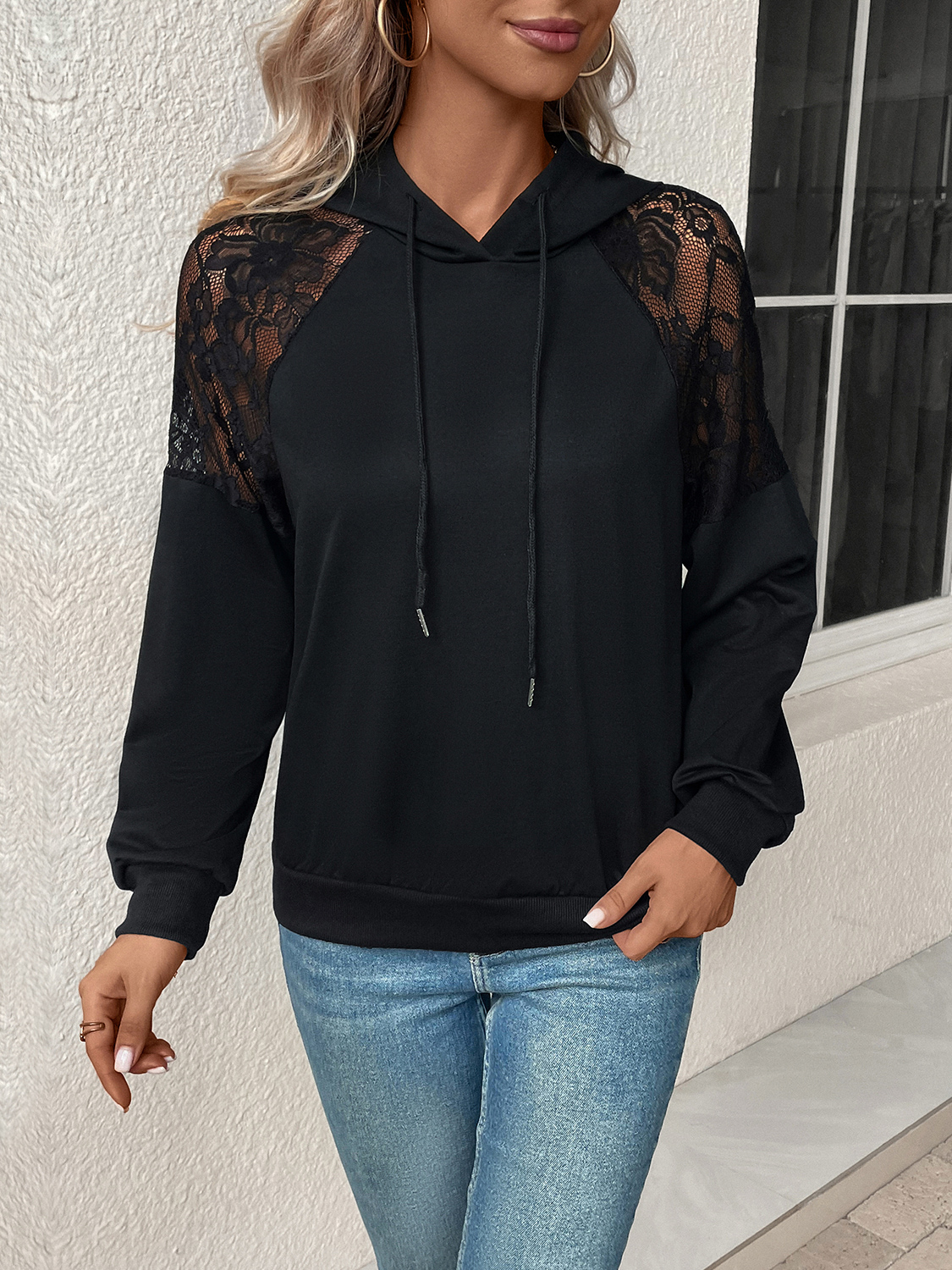 Lace Detail Drawstring Long Sleeve Hoodie