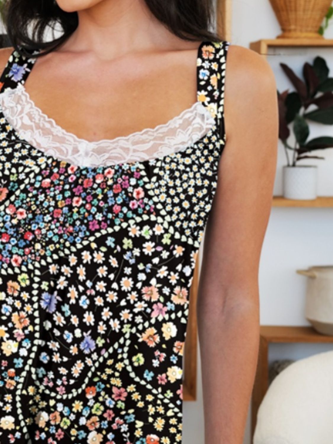 Lace Detail Printed Wide Strap Mini Dress