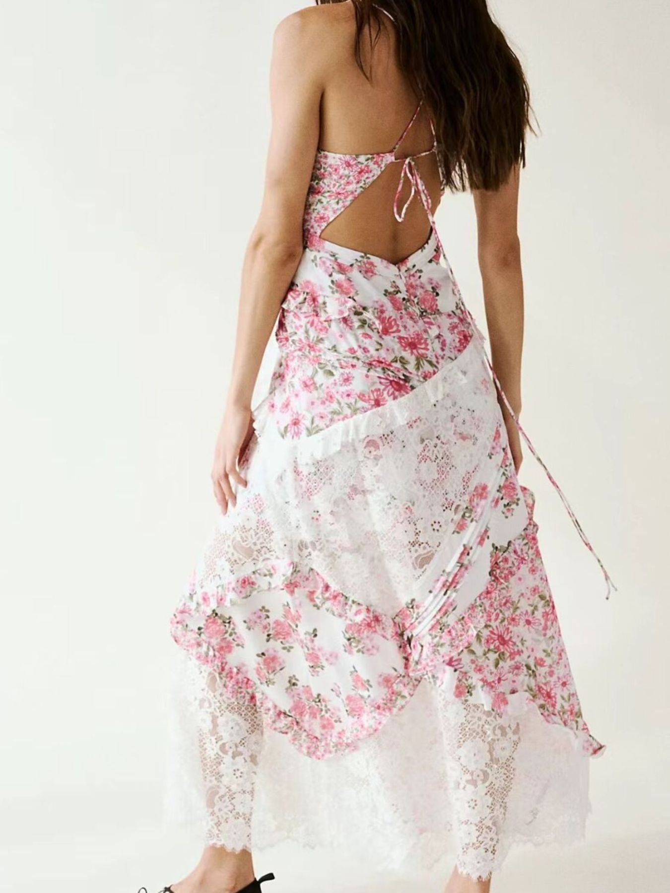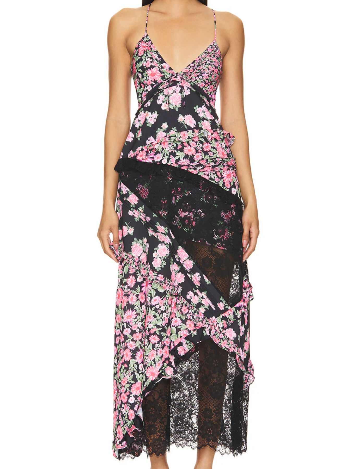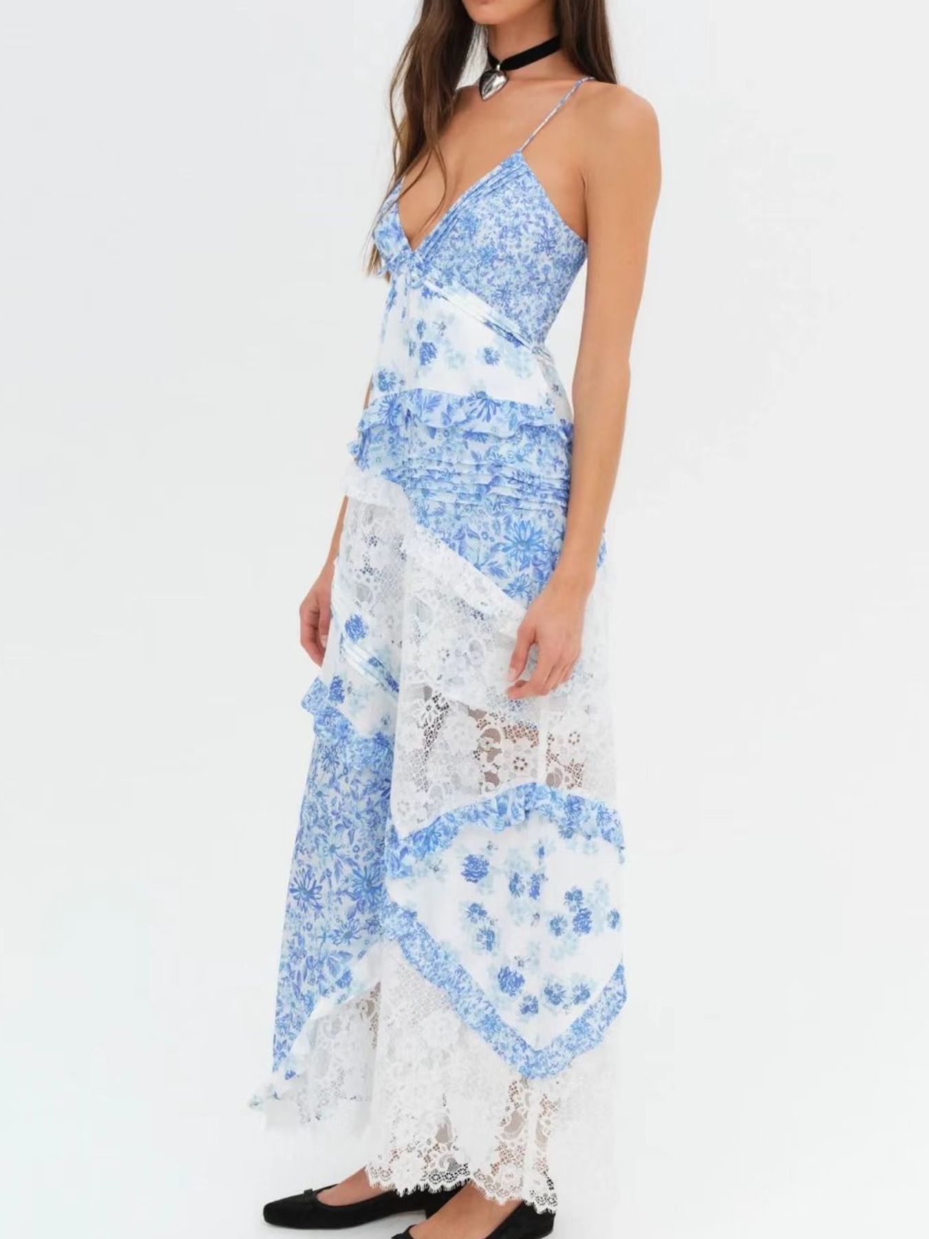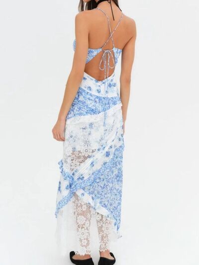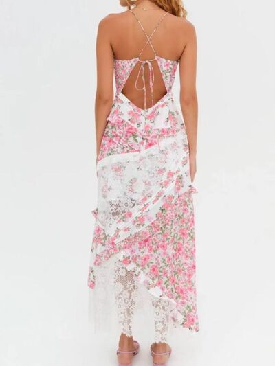 Lace Detail Ruffled Floral V-Neck Maxi Dress