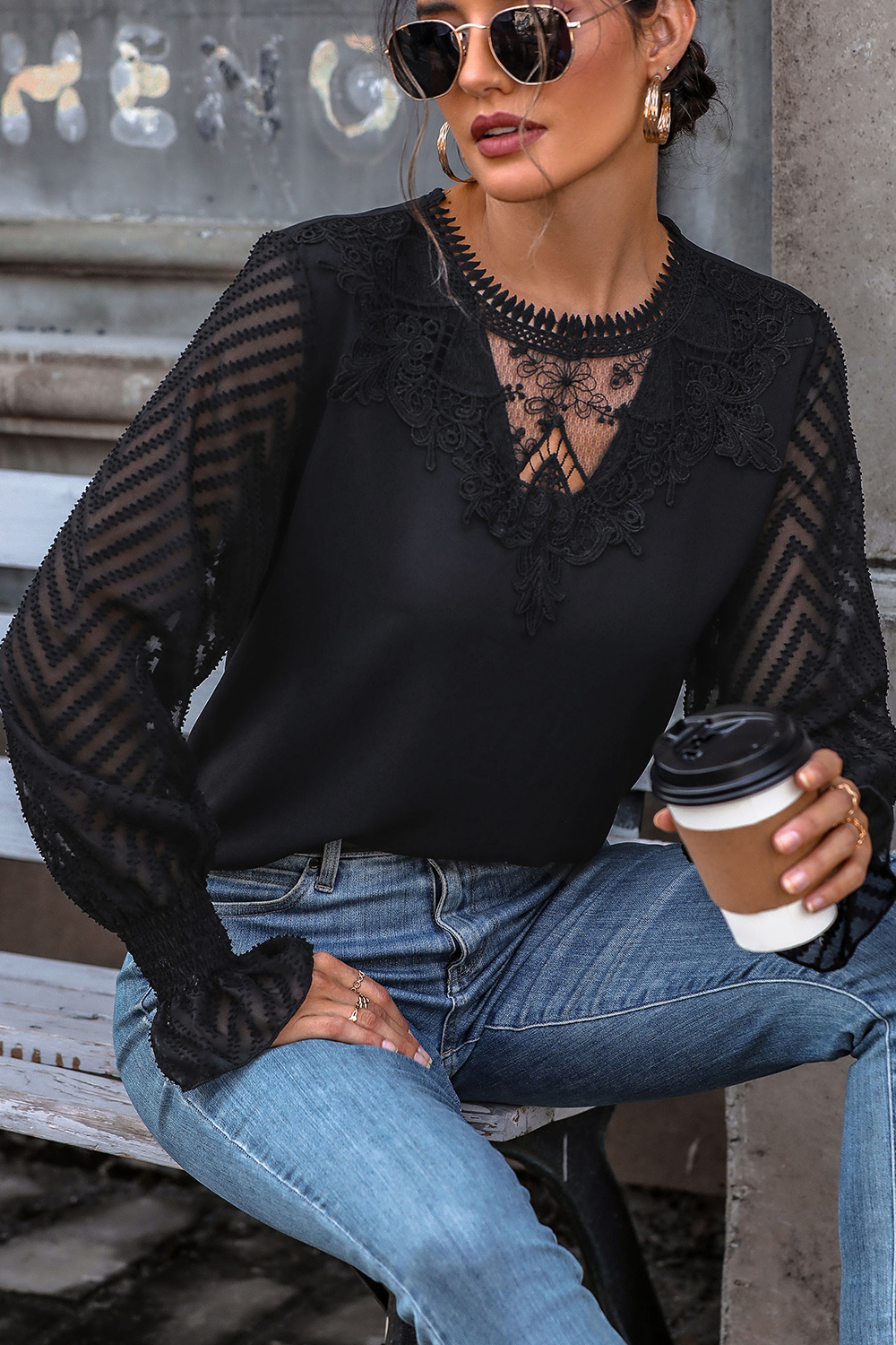 Lace Detail Smocked Flounce Sleeve Blouse