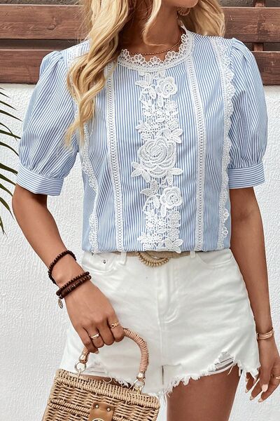 Lace Detail Striped Round Neck Half Sleeve Blouse